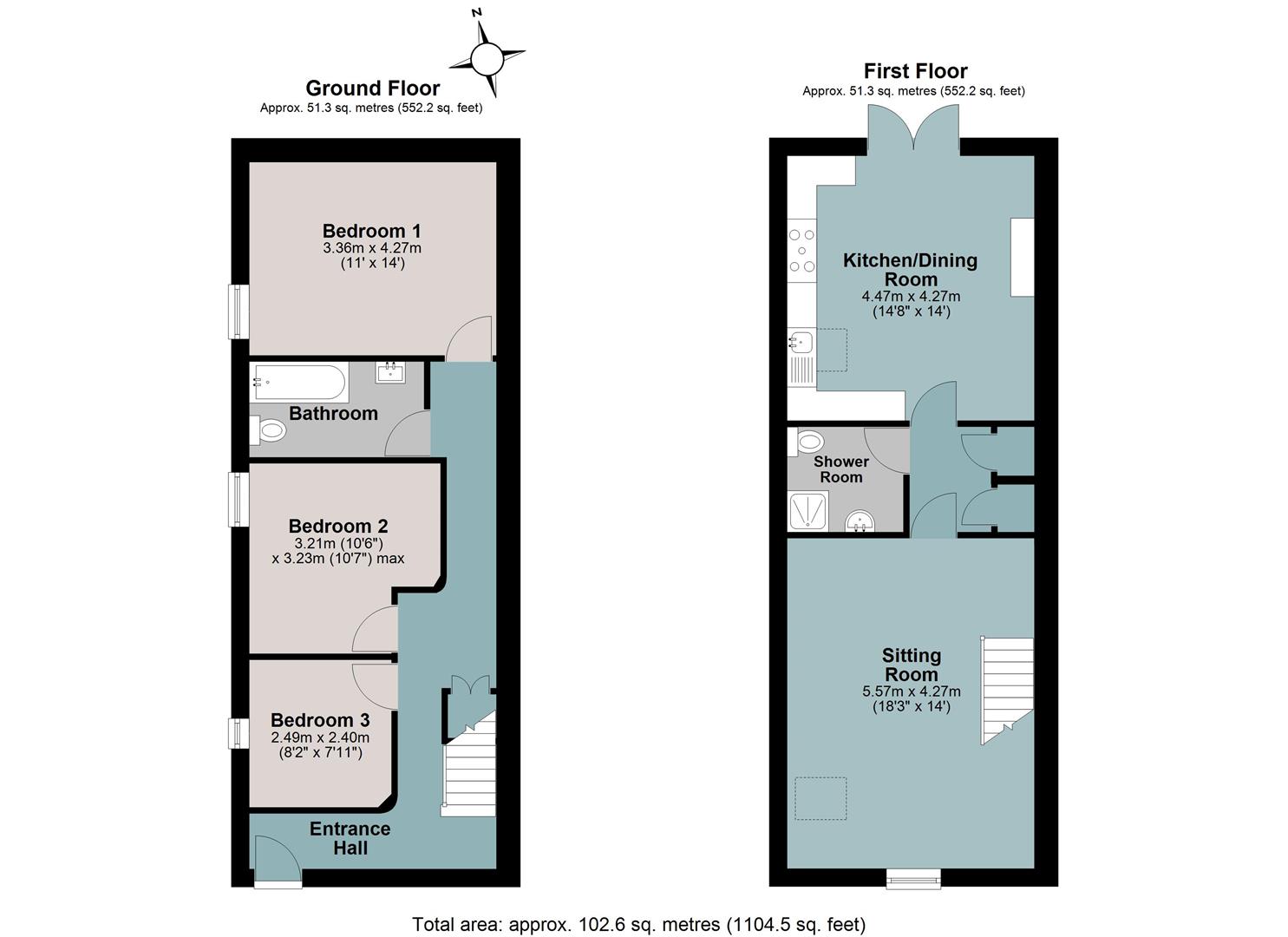 The front door opens into a welcoming hallway, leading to the ground floor where three generous bedrooms and a family bathroom are arranged, offering comfortable accommodation.