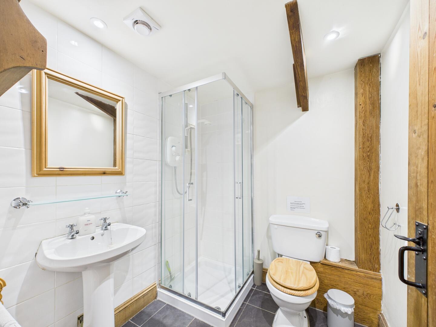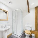 Upstairs, the living room features exposed wooden beams, creating a warm and inviting space. A shower room with built-in storage opposite is thoughtfully positioned between the living room and the kitchen.