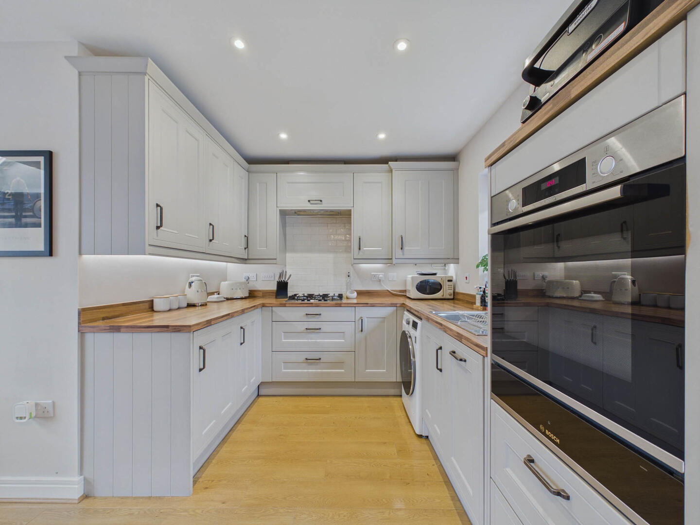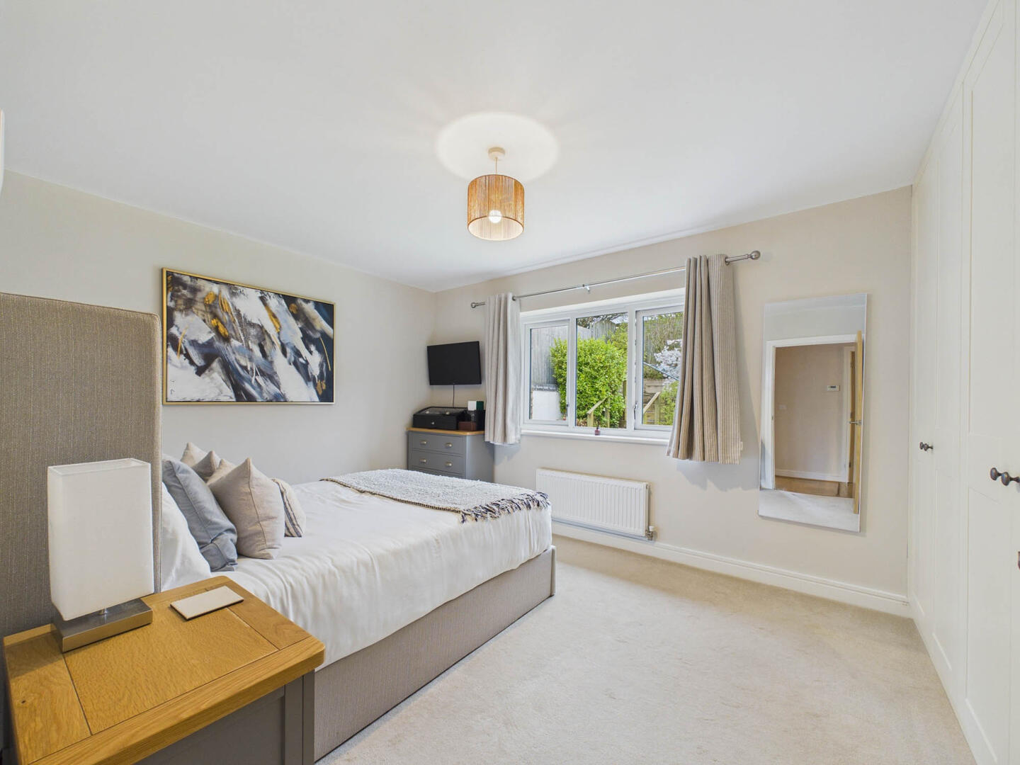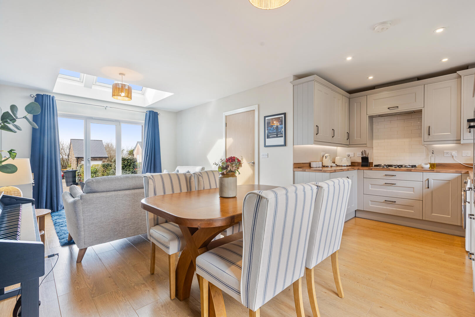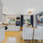 Externally, the property offers a large garage with mezzanine storage and a driveway providing parking for multiple vehicles. The low-maintenance rear garden includes a lawned area, patio and raised flower beds, creating several spaces to enjoy throughout the day. The front garden is also a pleasant addition to the property.