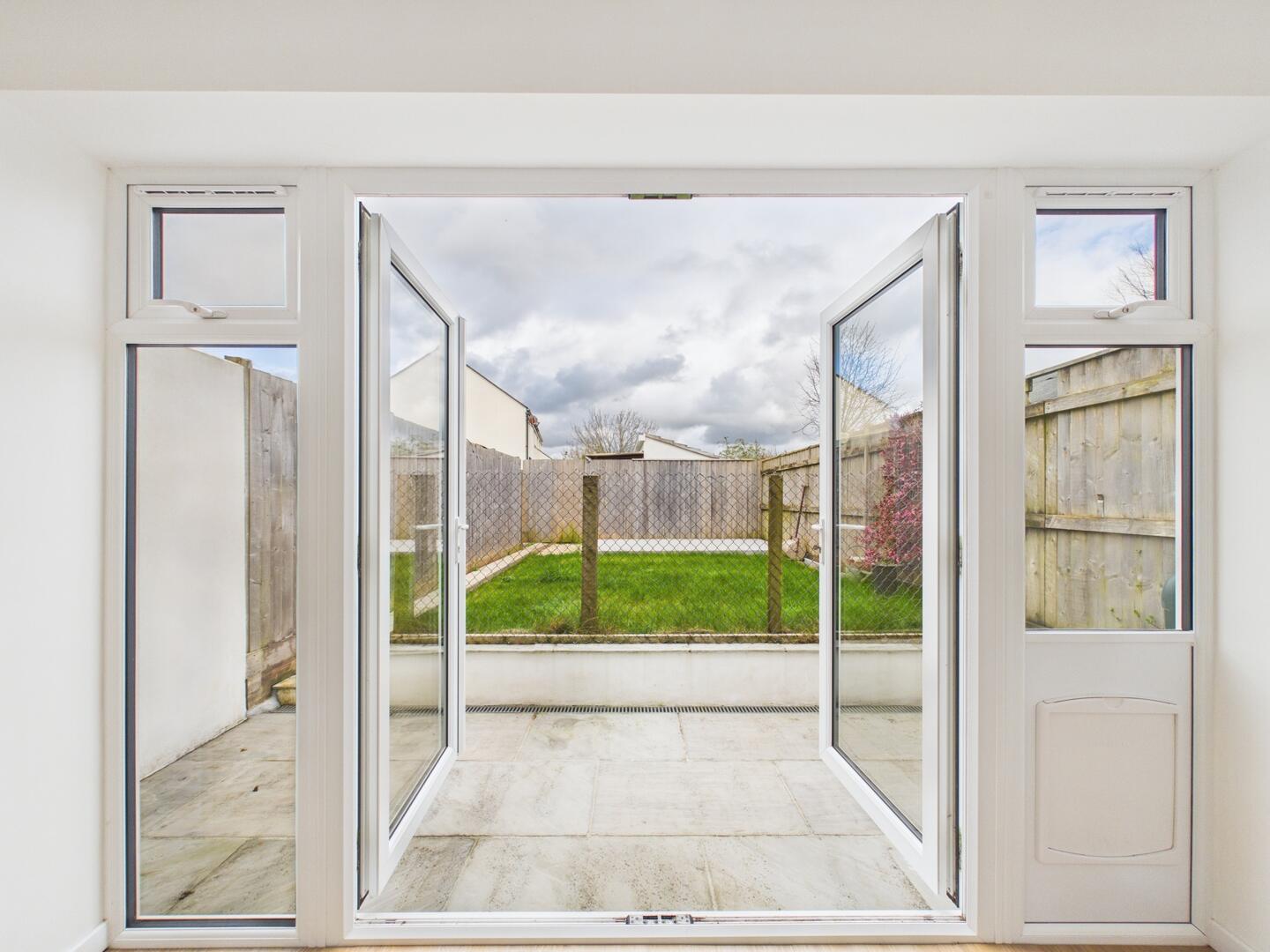 An attractive archway leads through to a welcoming living room, where double doors open directly onto the rear garden, creating an ideal indoor–outdoor flow.