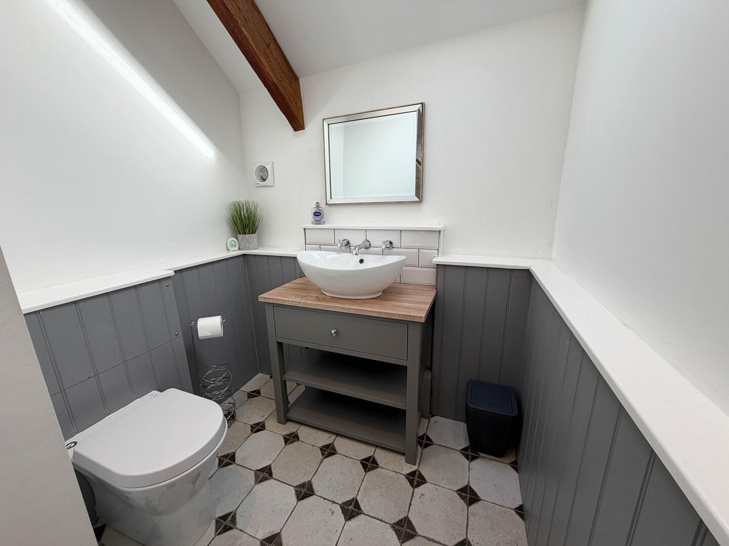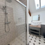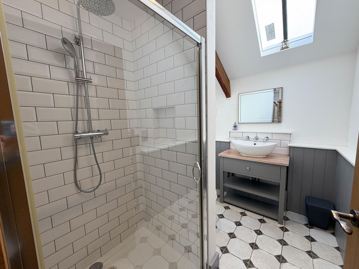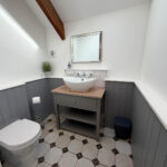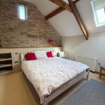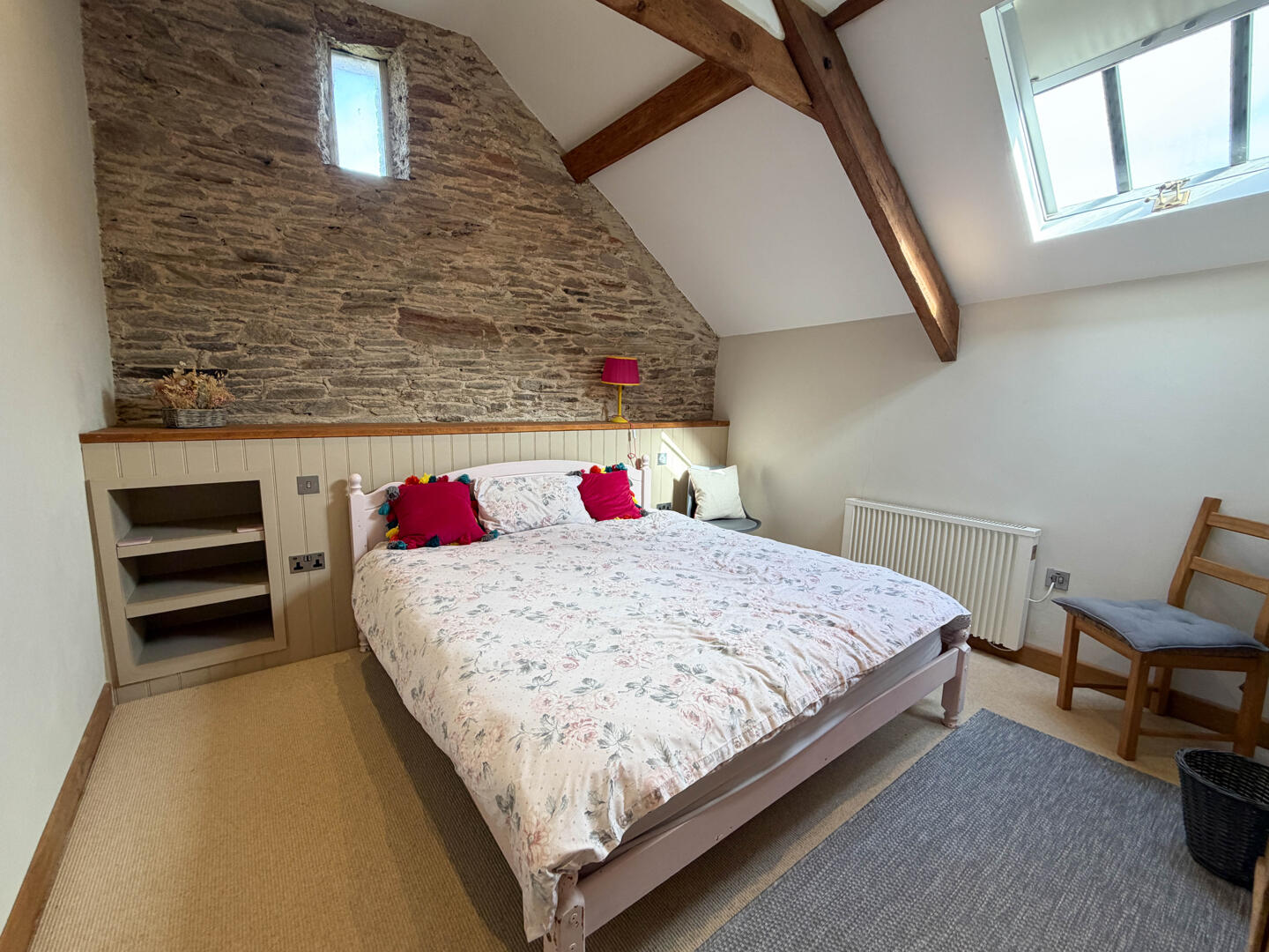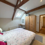 Upstairs, the first floor features a spacious bedroom on the right, with characterful details such as exposed stone and beams. Opposite the bedroom is a shower room.