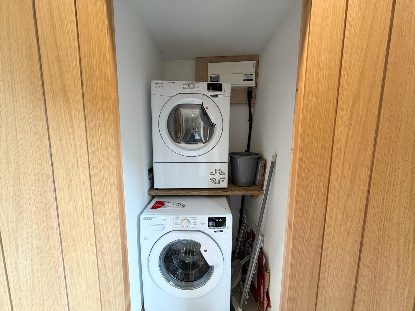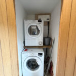 On the ground floor, the entrance hall includes a cupboard currently housing the washing machine and tumble dryer. Beyond the hall, the property opens into a combined kitchen, living, and dining area.
