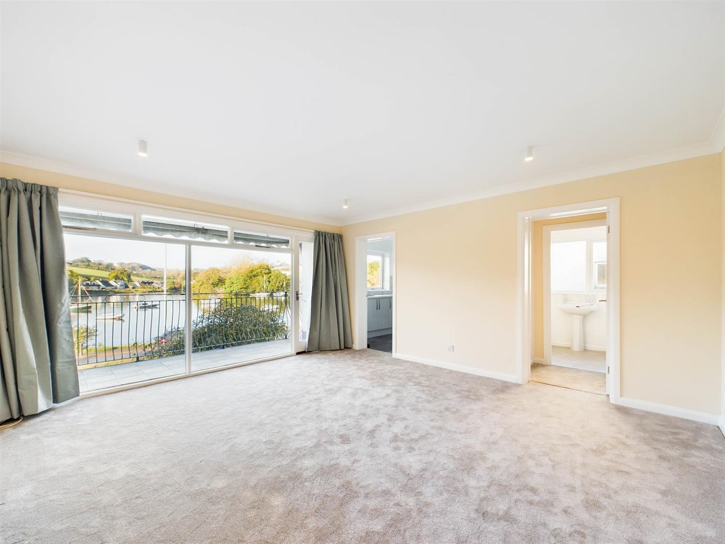To the right is the bright sitting/dining room, this is a well-proportioned room with front glazed wall affording delightful views of the Kingsbridge estuary, across to Tacket Wood and a door opening on to the spacious balcony where spectacular views of the estuary and surrounding area can be enjoyed.