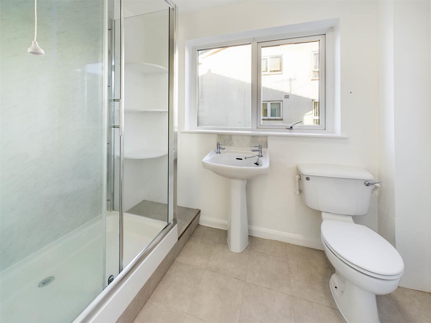 A lobby area with built-in storage cupboards opens to the shower room, the white suite comprises double shower cubicle, wash hand basin and WC.