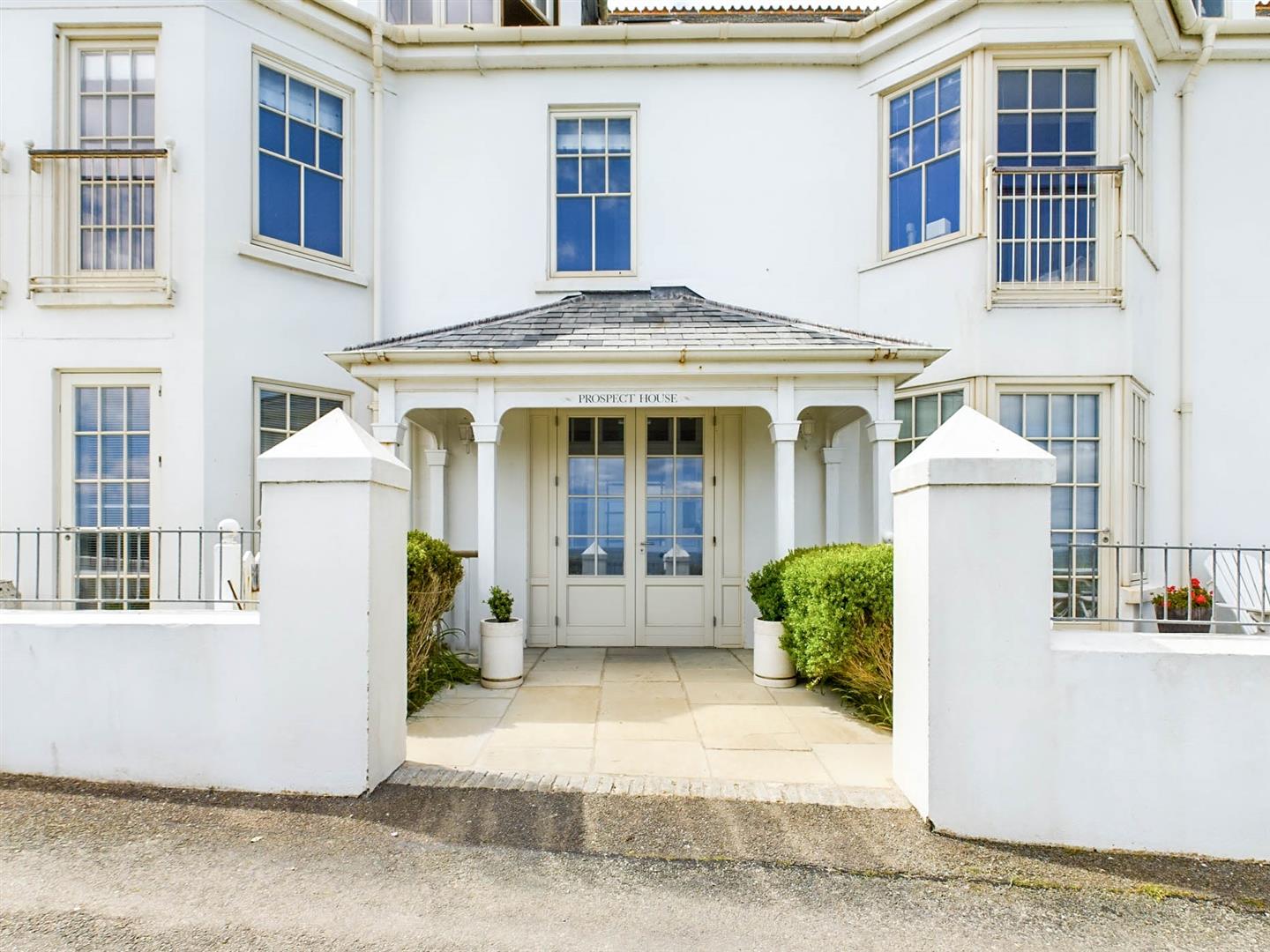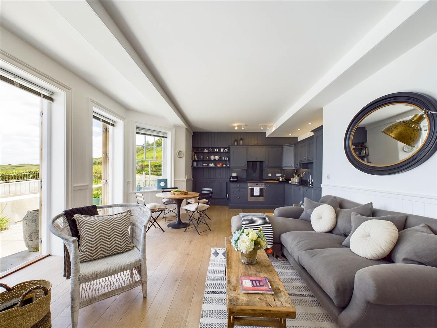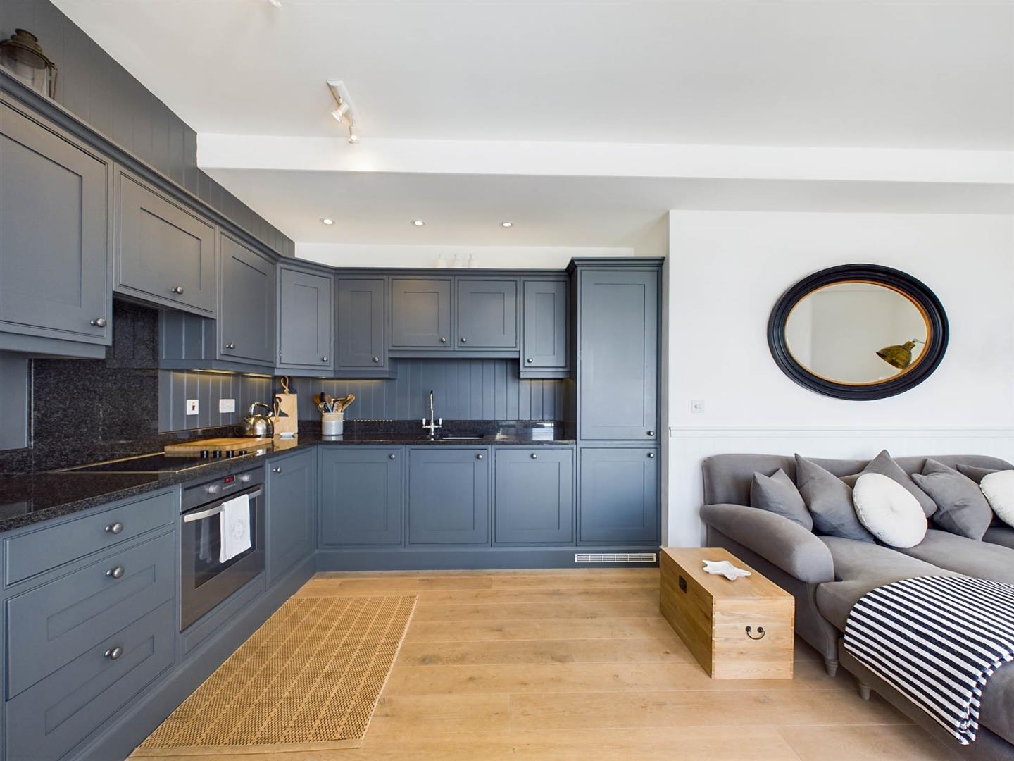 Welcome to 3 Prospect House, a beautifully presented apartment that promises both luxury and convenience. As you enter the building through the communal entrance, you'll find the door to this charming apartment immediately on your left. Upon stepping inside, you are greeted by a welcoming entrance hall that seamlessly flows into an open-plan kitchen, living, and dining area. This stylish space features a bespoke kitchen in Farrow & Ball Downpipe equipped with an array of wall and floor cupboards, along with integrated appliances including dishwasher, washing machine, oven and hob. The living area boasts two sets of doors that open onto the front patio, where you can relish in the stunning, uninterrupted sea views that Prospect House is renowned. This is the perfect spot for morning coffees or evening relaxation while enjoying the serene coastal scenery.