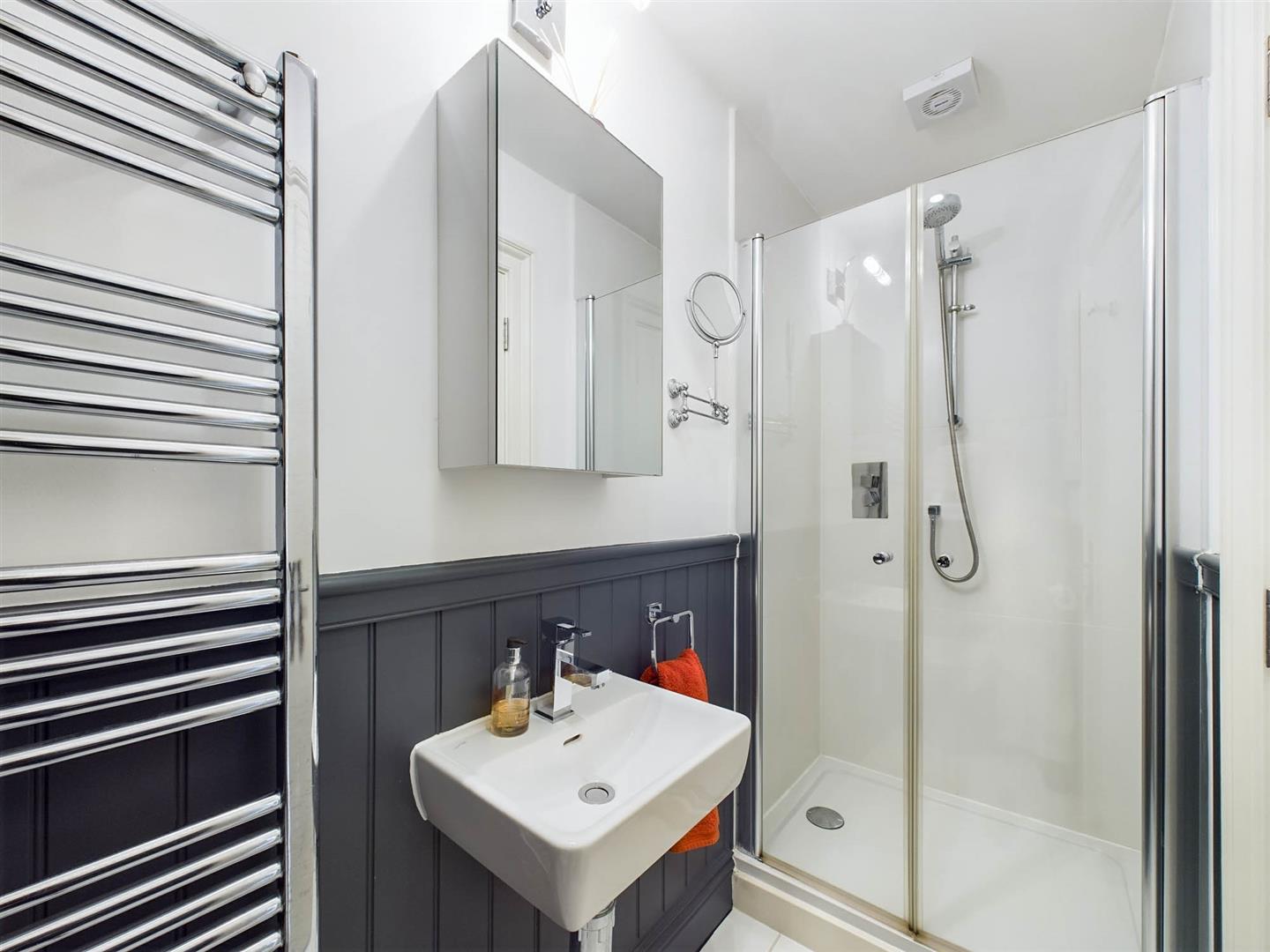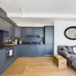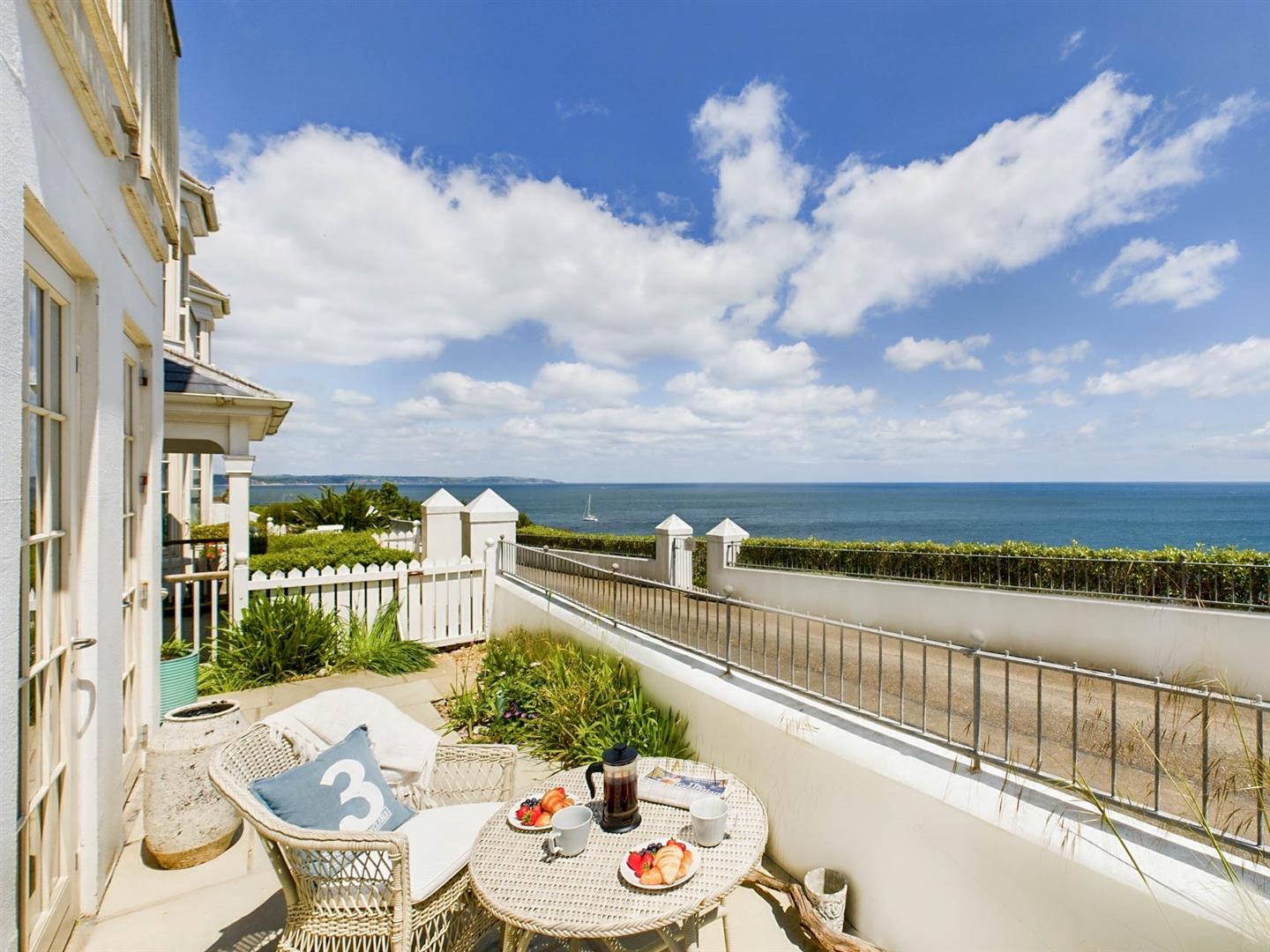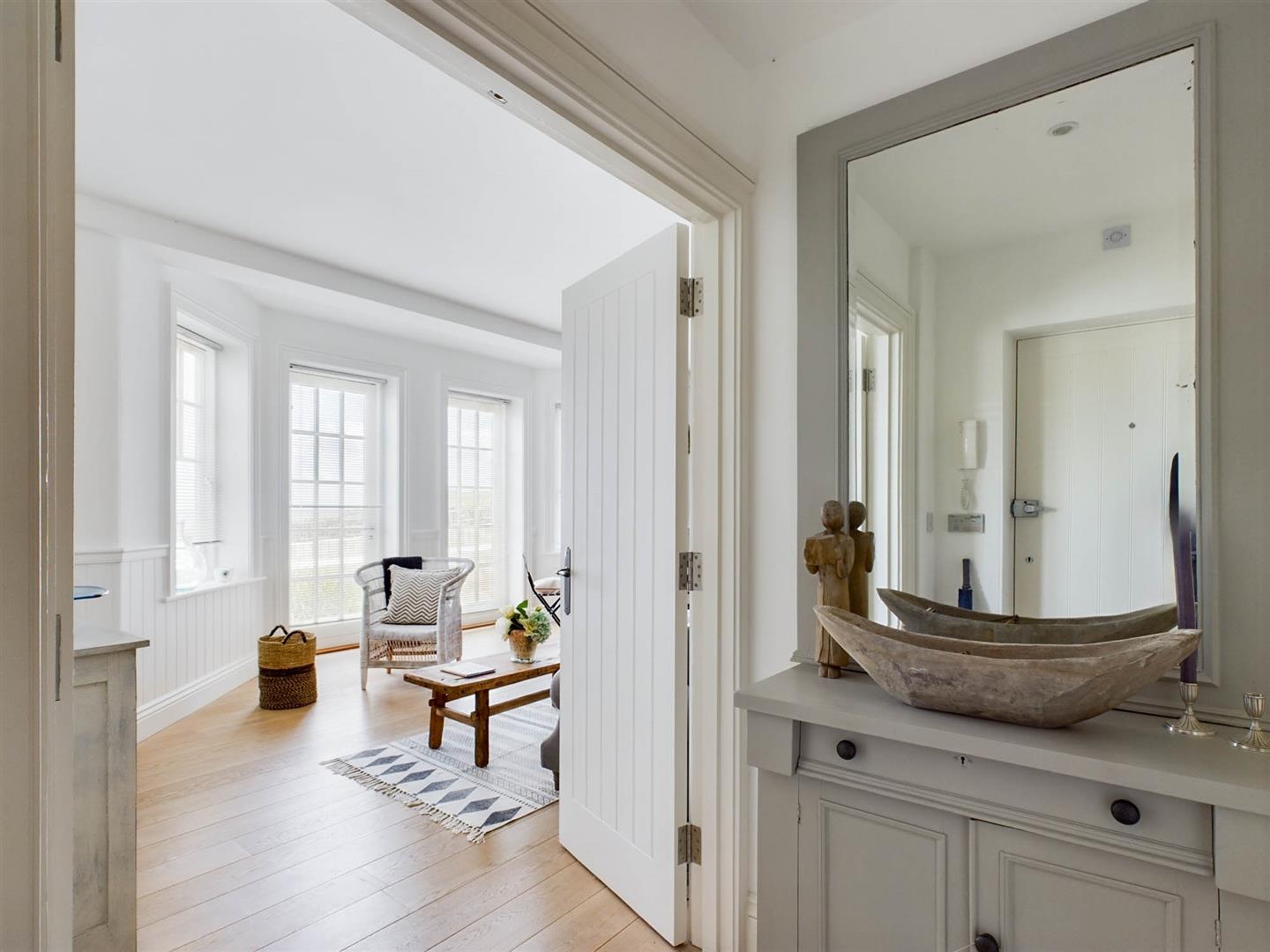 Welcome to 3 Prospect House, a beautifully presented apartment that promises both luxury and convenience. As you enter the building through the communal entrance, you'll find the door to this charming apartment immediately on your left. Upon stepping inside, you are greeted by a welcoming entrance hall that seamlessly flows into an open-plan kitchen, living, and dining area. This stylish space features a bespoke kitchen in Farrow & Ball Downpipe equipped with an array of wall and floor cupboards, along with integrated appliances including dishwasher, washing machine, oven and hob. The living area boasts two sets of doors that open onto the front patio, where you can relish in the stunning, uninterrupted sea views that Prospect House is renowned. This is the perfect spot for morning coffees or evening relaxation while enjoying the serene coastal scenery.