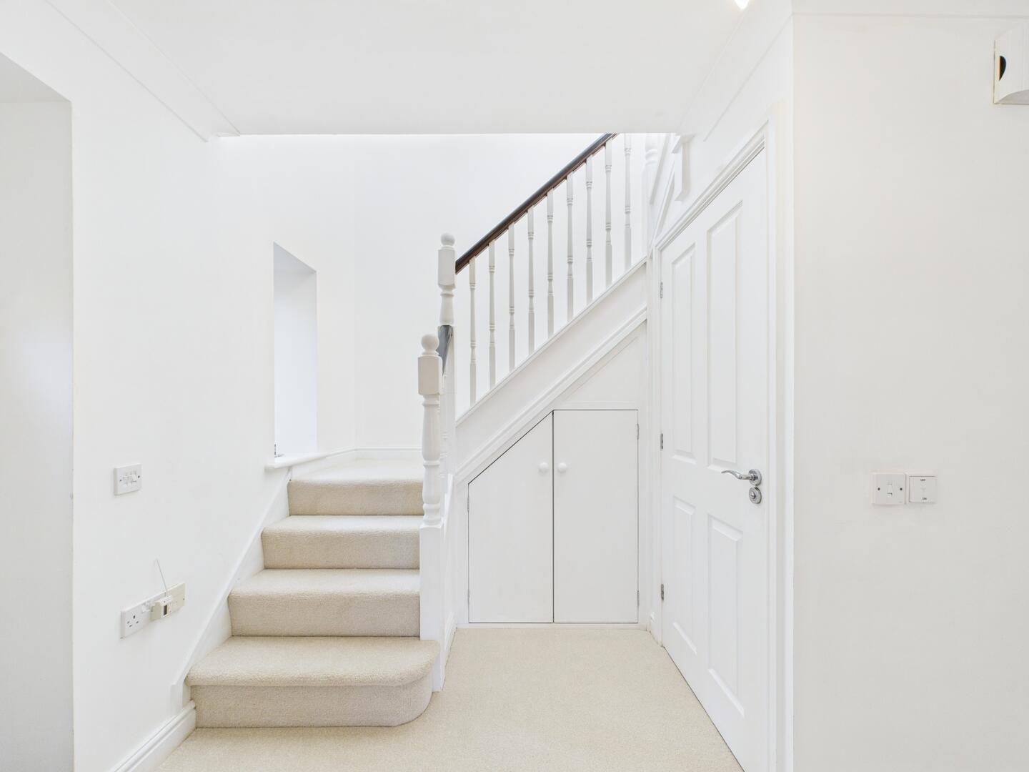 The ground floor offers a spacious living room, perfect for relaxation and entertaining. This room is highlighted by doors that open to the outside, allowing for plenty of natural light and seamless indoor-outdoor living. Additionally, the room also benefits from built-in storage. The kitchen has both wall and floor cupboards, providing ample storage space. It boasts extensive countertops, making meal preparation a breeze, and includes a built-in oven with an electric hob. Adjoining the kitchen is the sun room with under floor heating which is currently utilised as a dining room, a bright and airy space. This room features a door that leads directly to the back garden.