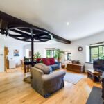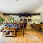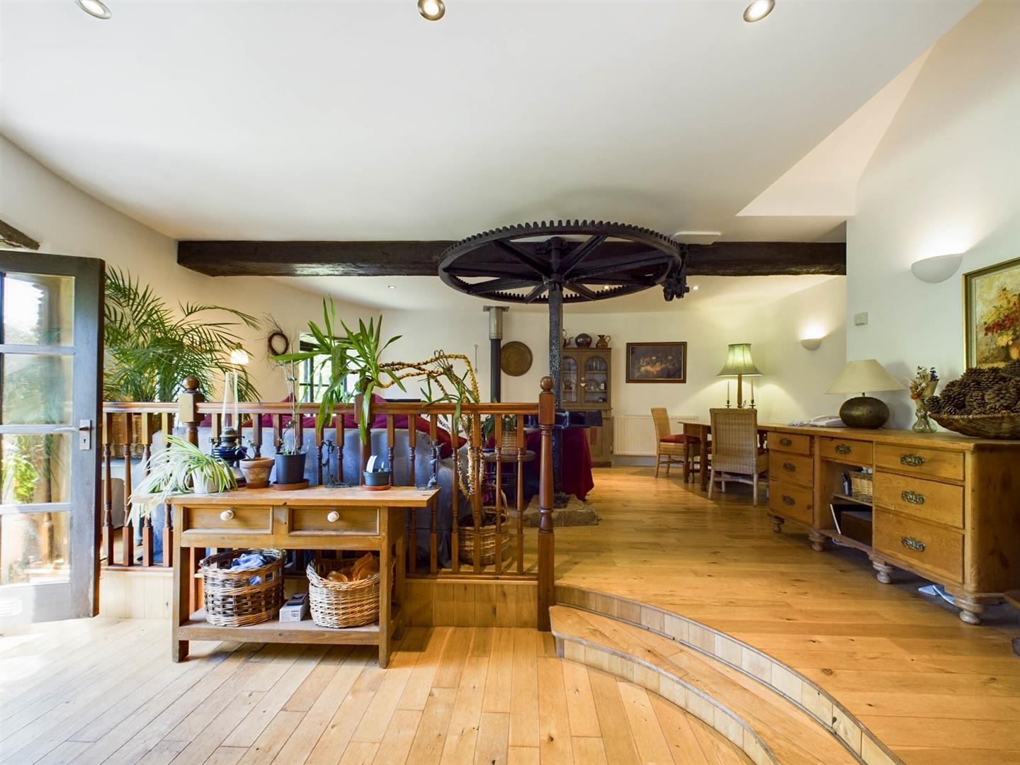 The ground floor is the heart of the home, presenting a spacious and inviting open-plan kitchen, living, and dining area. A unique feature of this space is the characterful steel wheel situated in the center of the living room. The well-equipped kitchen includes fitted appliances such as an oven, electric hob, fridge/freezer, and dishwasher. A couple of steps lead you to the comfortable living and dining areas. A door opens up to the tranquil garden. This sun-drenched haven is filled with beautiful flowers and offers lovely countryside views, making it an ideal spot for relaxation.