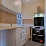 The property comprises an entrance hallway, a kitchen equipped with a free-standing cooker, an extractor fan, and space for a washing machine, as well as a sitting room with a range of wall-mounted storage units.