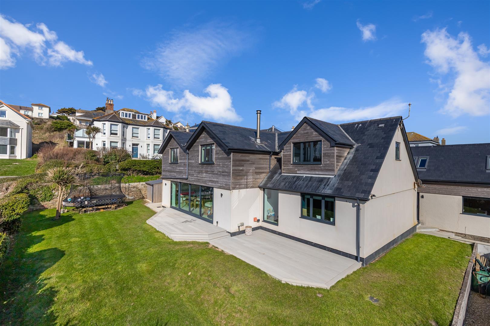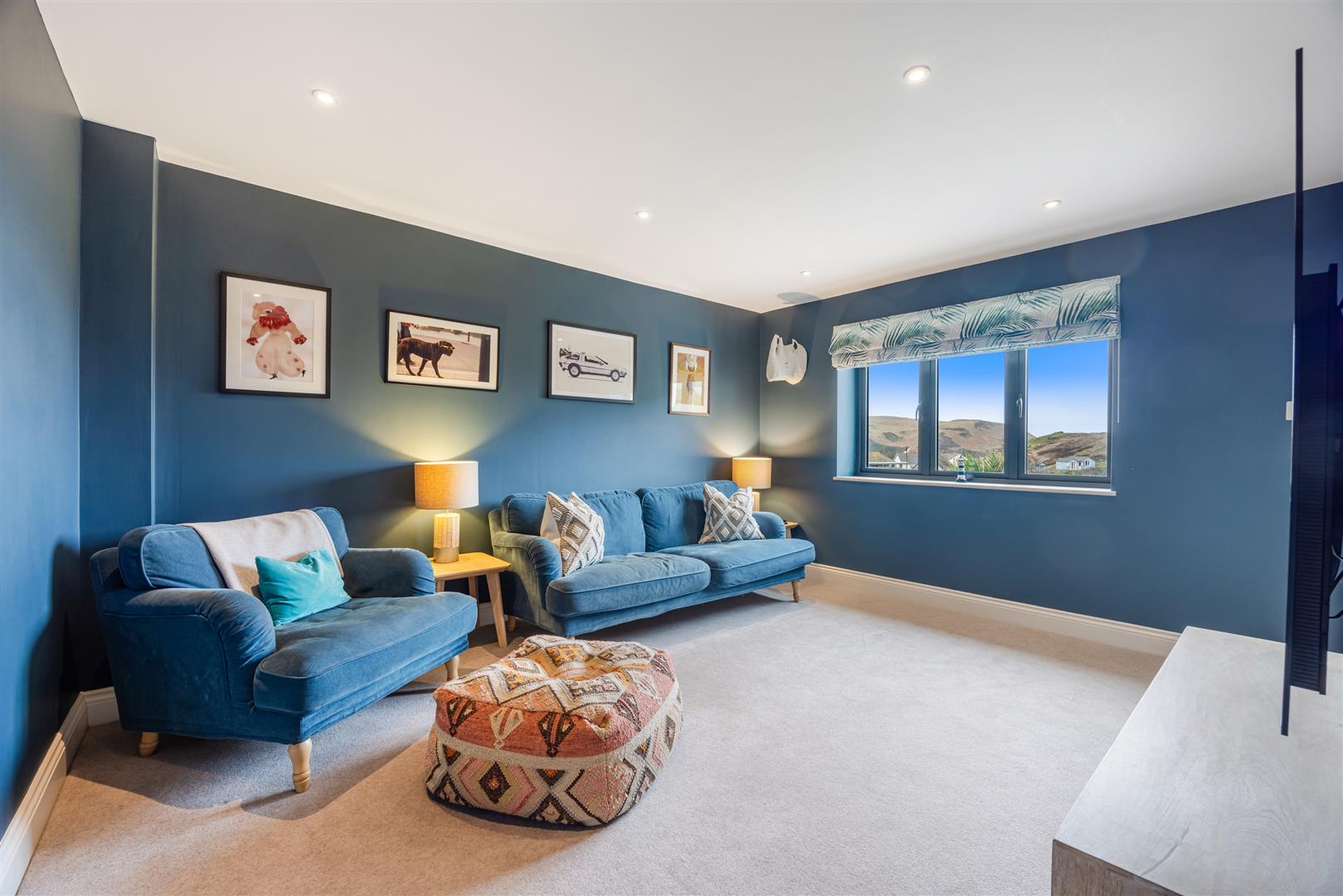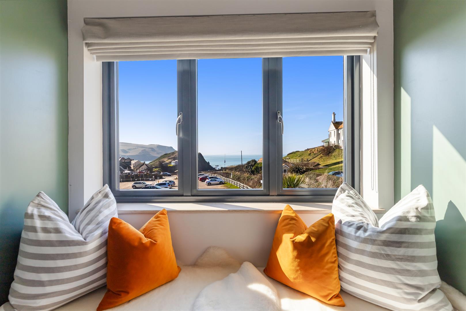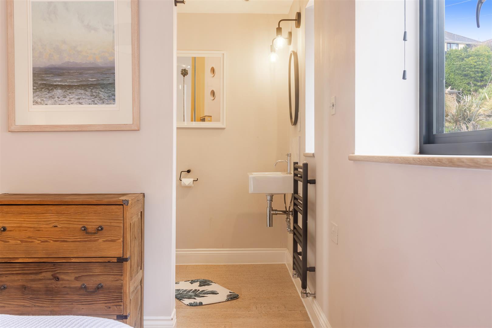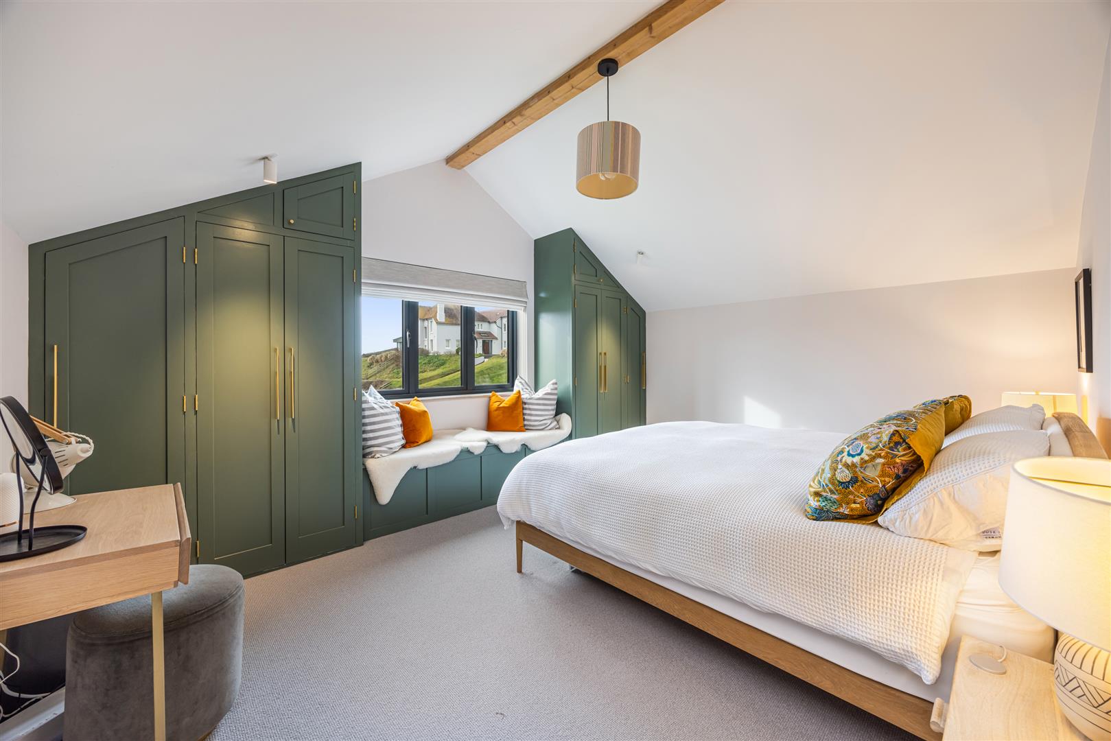 Upstairs, vaulted ceilings and bespoke finishes create an atmosphere of refined elegance. The master suite is a private sanctuary, complete with a spacious en-suite bathroom, built-in wardrobes, and a charming window seat perfectly positioned to take in the mesmerising sea views. Additional accommodation includes a stylish double bedroom, a luxurious family bathroom, and a grand bedroom with four bespoke bunk beds. Another en-suite bedroom benefits from eaves storage, with three of the principal bedrooms enjoying magnificent coastal outlooks.