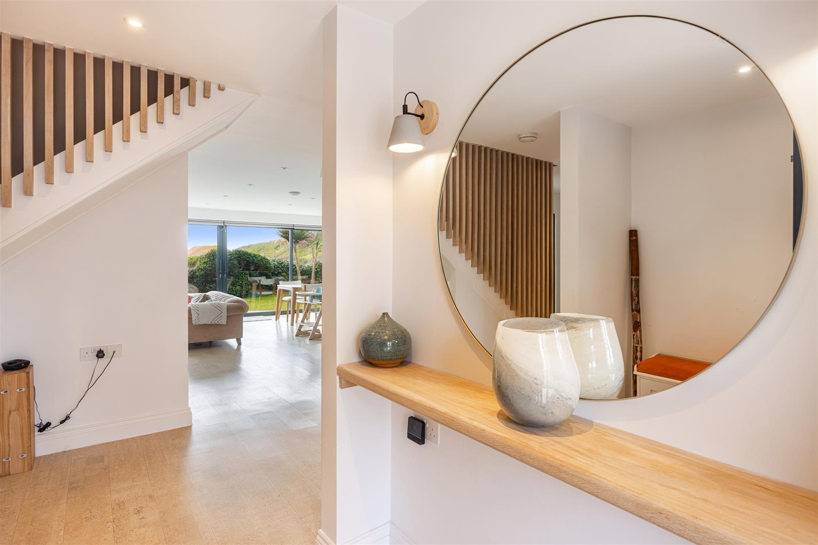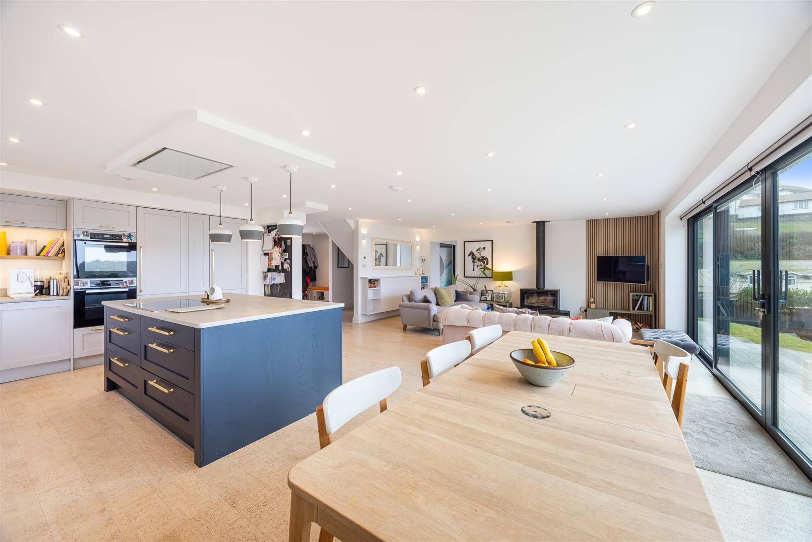 From the moment you arrive, Rockcliffe exudes sophistication. The welcoming entrance hallway sets the tone for the rest of the home, leading to an expansive open-plan kitchen, dining, and living area. Bespoke sliding doors span the front of the property, seamlessly integrating indoor and outdoor spaces while framing breath-taking coastal vistas. The custom-designed kitchen is a chef's delight, featuring a large island, premium appliances, and a stylish log burner that enhances the warmth of the living area. A well-appointed utility room includes a shower and side access-ideal after a day on the beach.