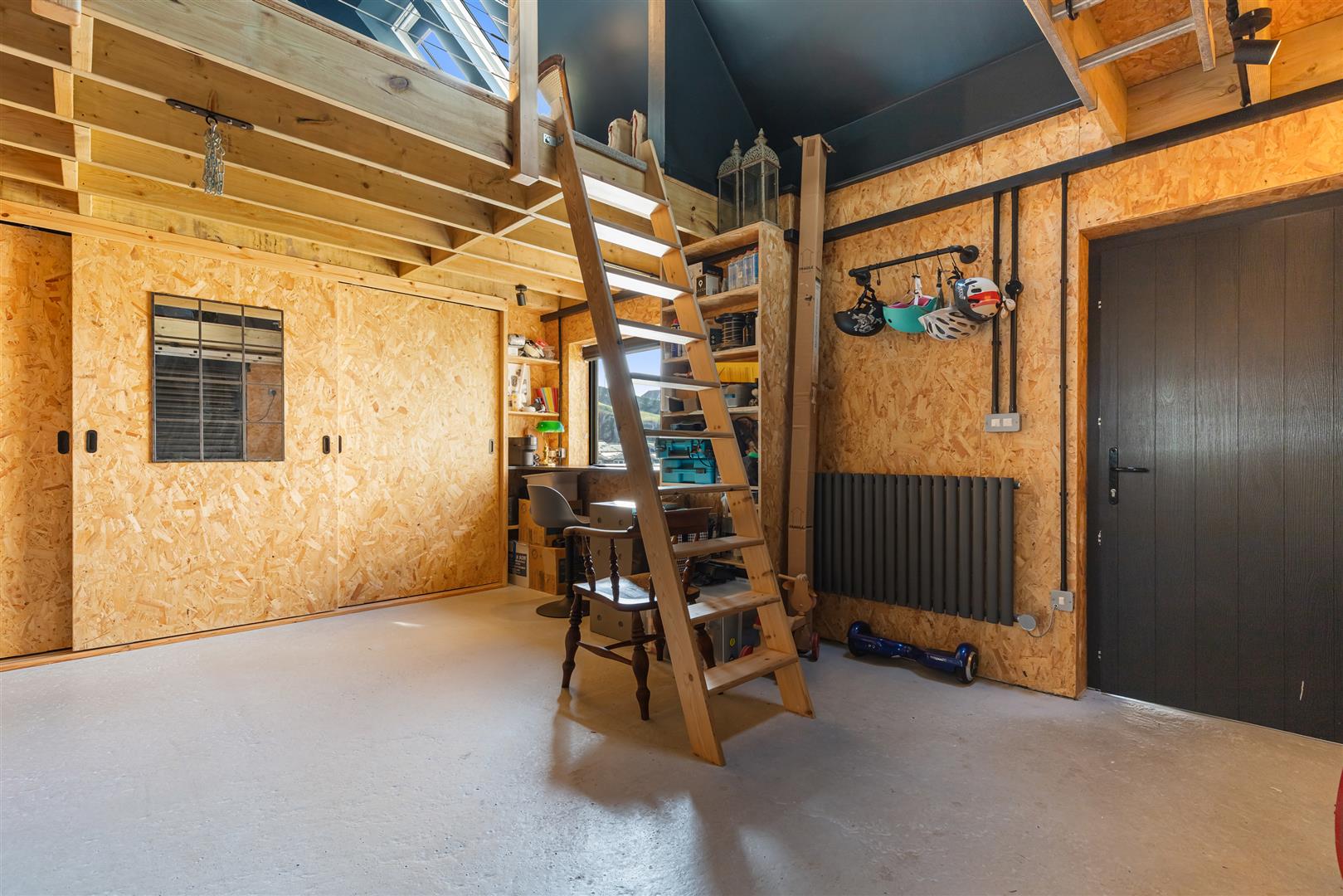 The exterior is equally impressive, with a meticulously landscaped wraparound garden, expansive Millboard decking areas, lush lawns, and an outdoor shower-ideal for rinsing off after coastal adventures. A private driveway, spacious enough for multiple vehicles, leads to a detached garage that combines practicality and versatility. It boasts electric doors, a high vaulted ceiling, a mezzanine level, and smart built-in storage. This space presents potential for use as a dedicated office with inspiring sea views.