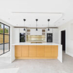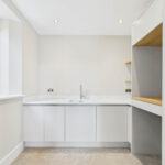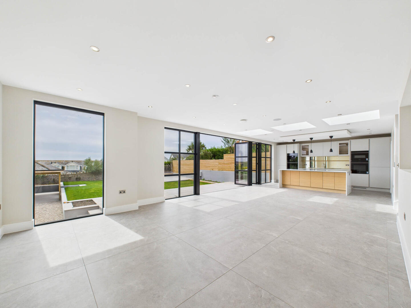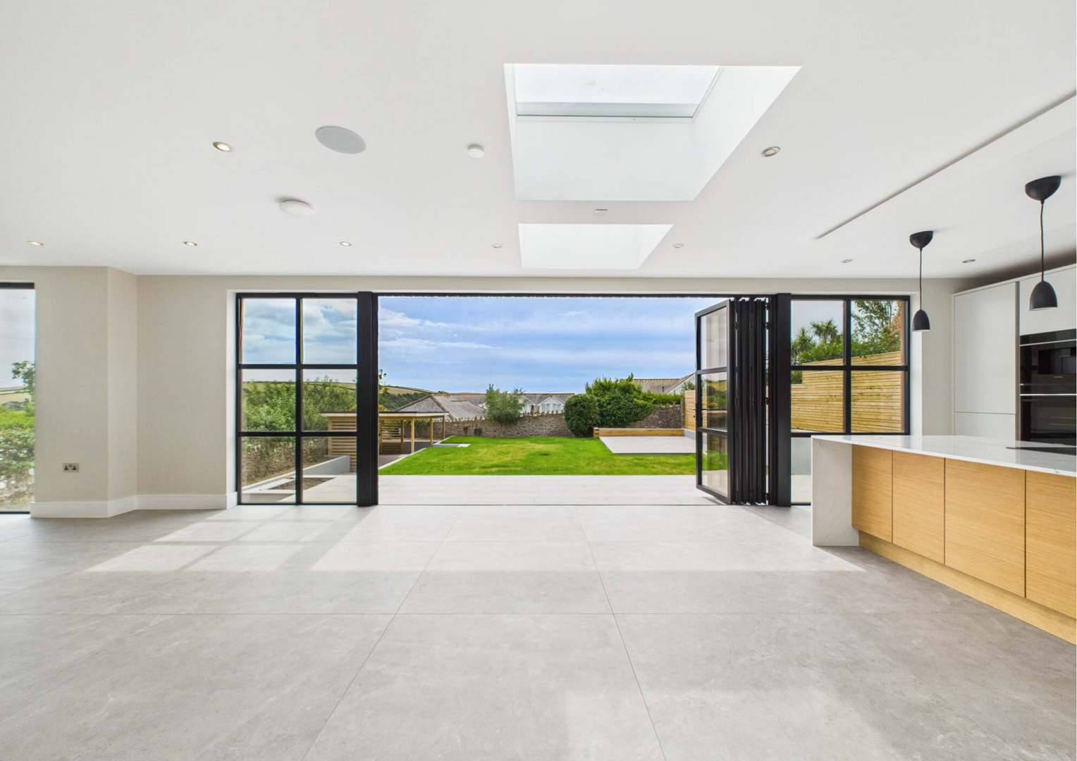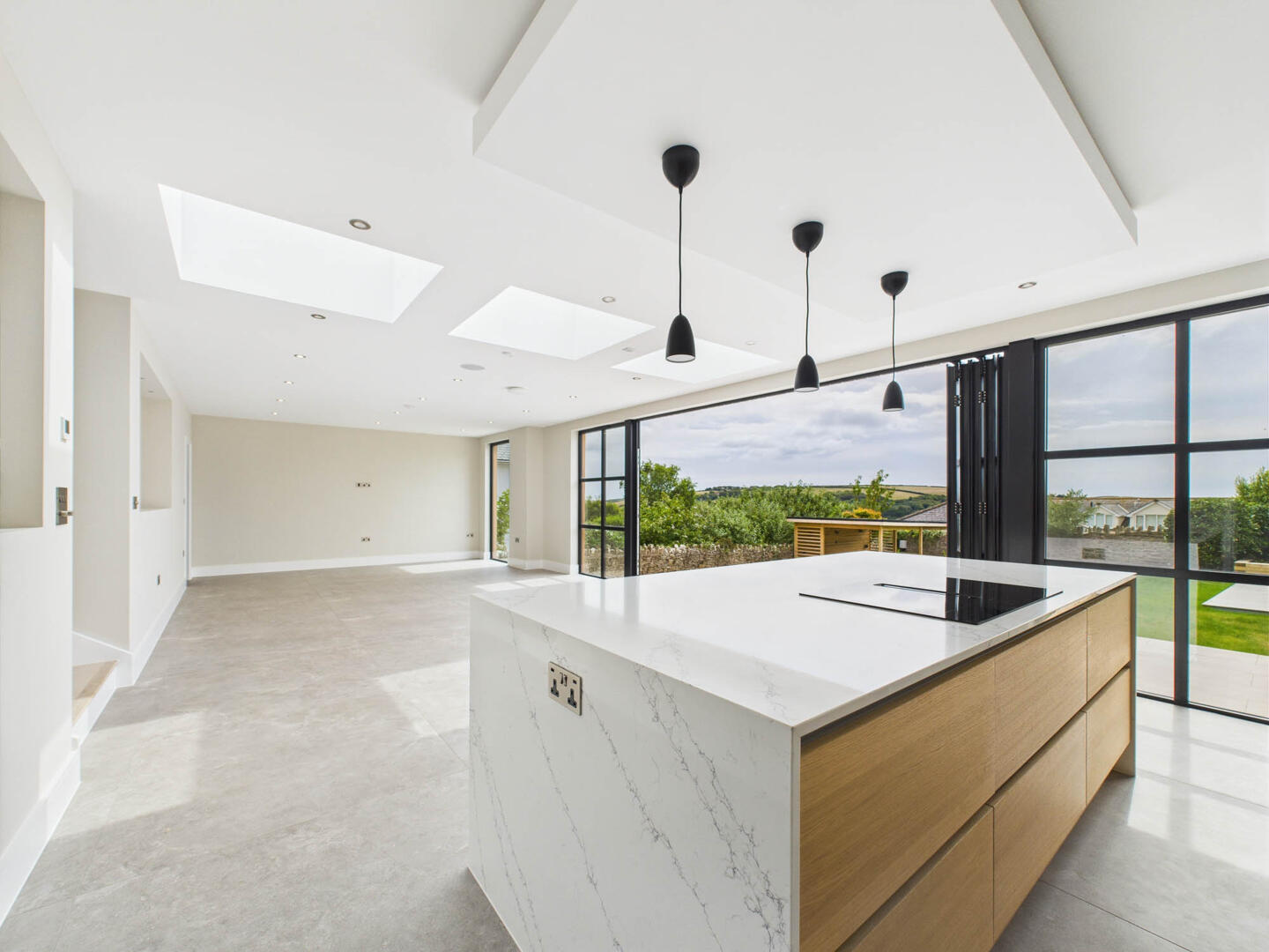 The heart of the home is an open-plan living area, where the kitchen, dining, and snug spaces flow seamlessly together. Bi-fold doors open directly onto a large patio, creating an effortless connection between the indoors and outdoors, all set against the tranquil backdrop of the countryside and Salcombe Harbour. The kitchen itself has been designed with both practicality and elegance in mind, featuring integrated Siemens appliances, an island for hosting, and a hidden utility and pantry area - perfect for both family living and entertaining.