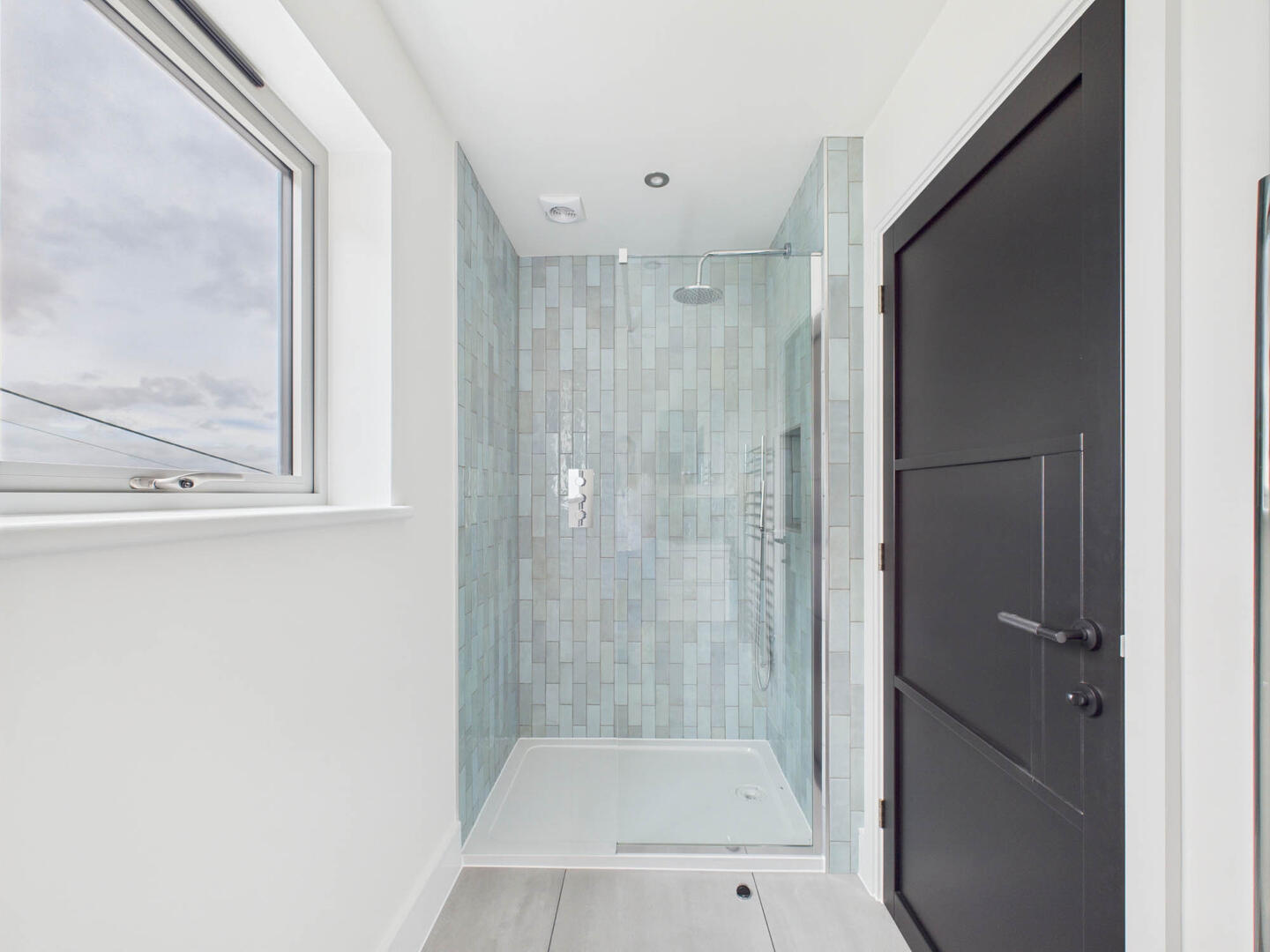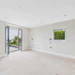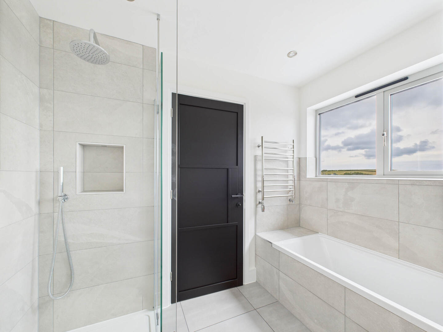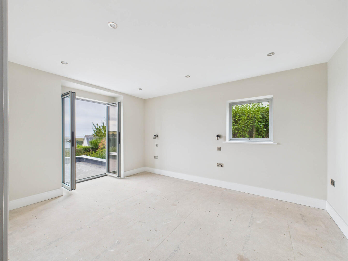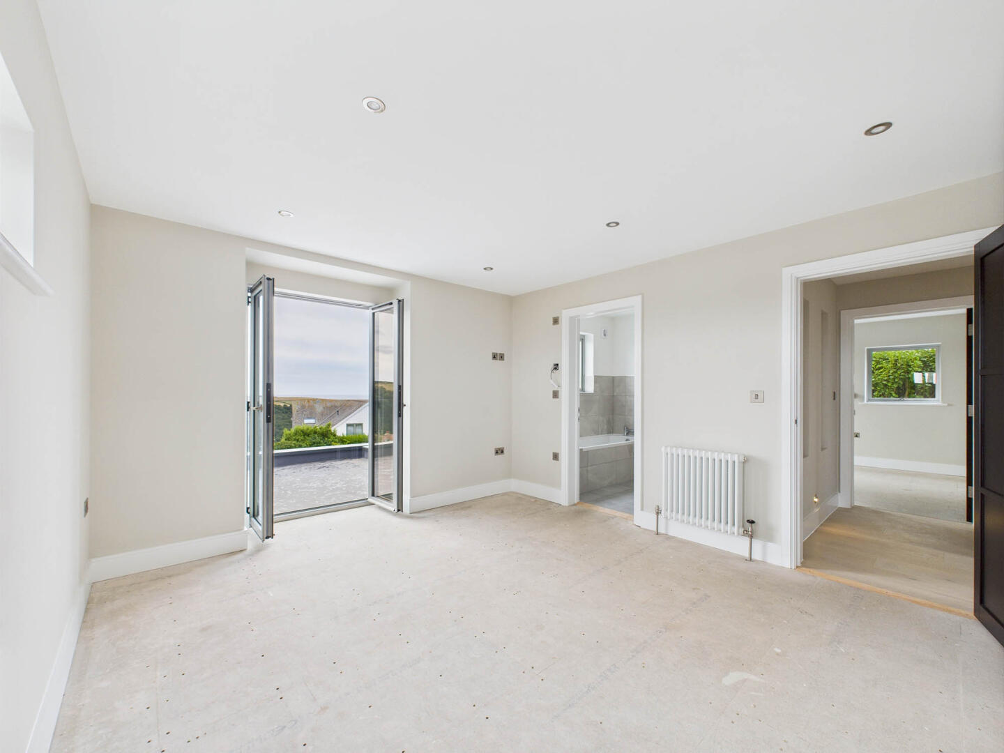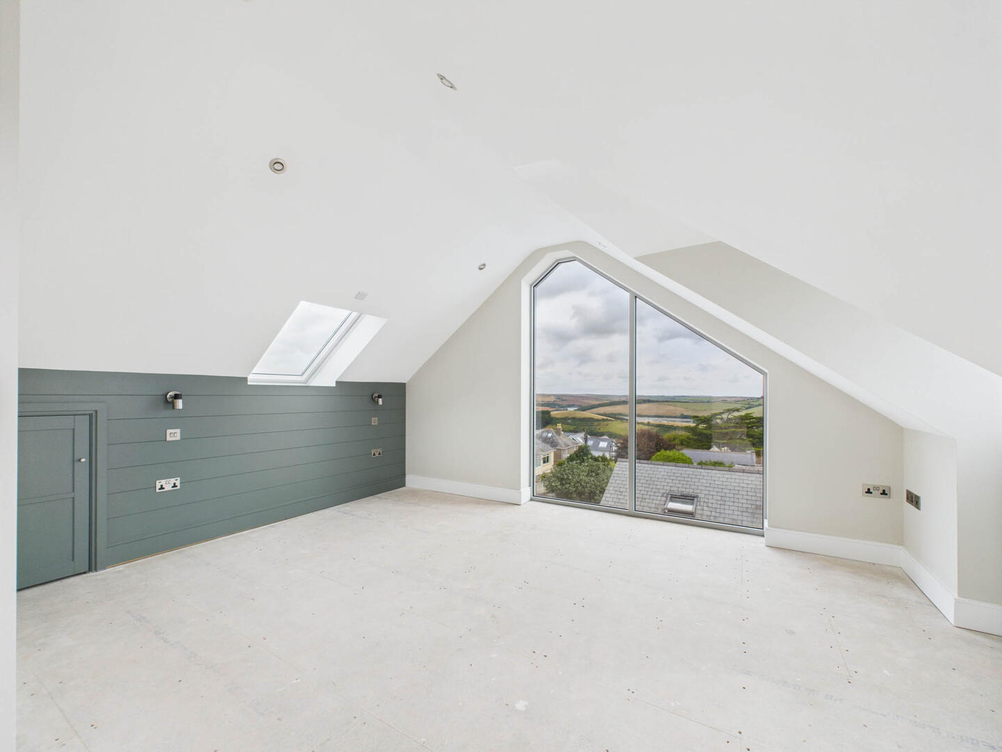 As you enter the principal suite, you're immediately struck by the breathtaking views. A stunning floor-to-ceiling framed window floods the room with natural light, revealing a postcard-perfect panorama of Salcombe Estuary, the rolling hills of the South Hams, and even stretching toward Dartmoor. It's a sight that captures the essence of coastal living at its finest. It's a view that feels almost unreal, as if you're living in a painting. In addition, a Velux Cabrio window opens up to a balcony, elevating the experience, allowing you to step out and feel on top of the world. The suite is designed to embrace these magnificent views, with a spacious en-suite bathroom and dressing room that add the perfect touch of luxury. It's a room that makes you feel as though you've found your own private sanctuary.