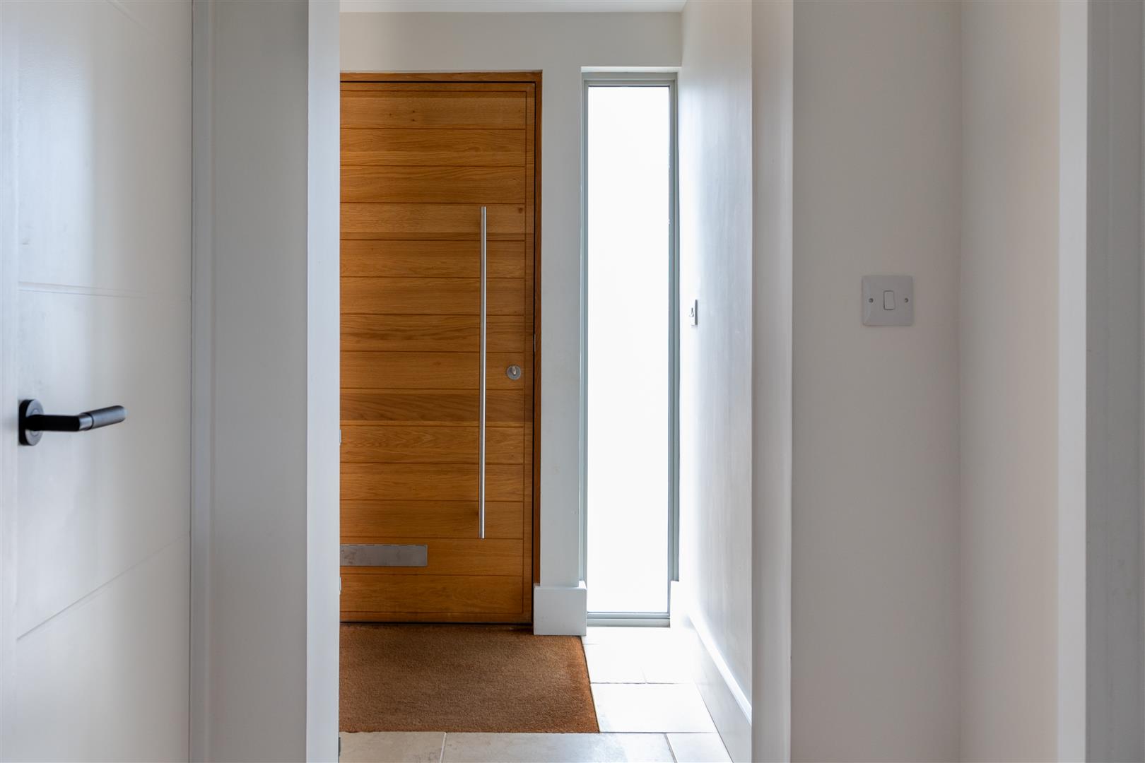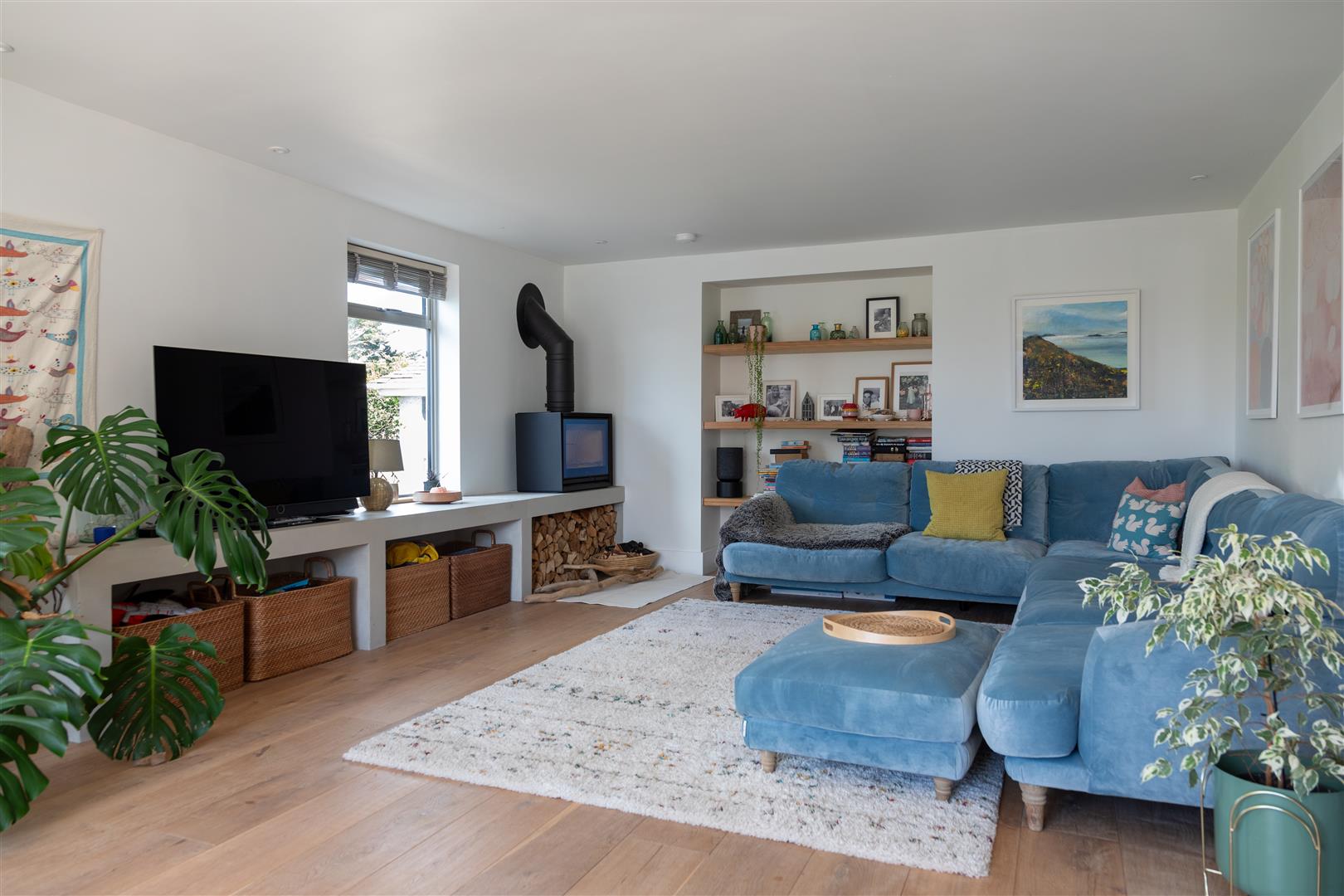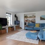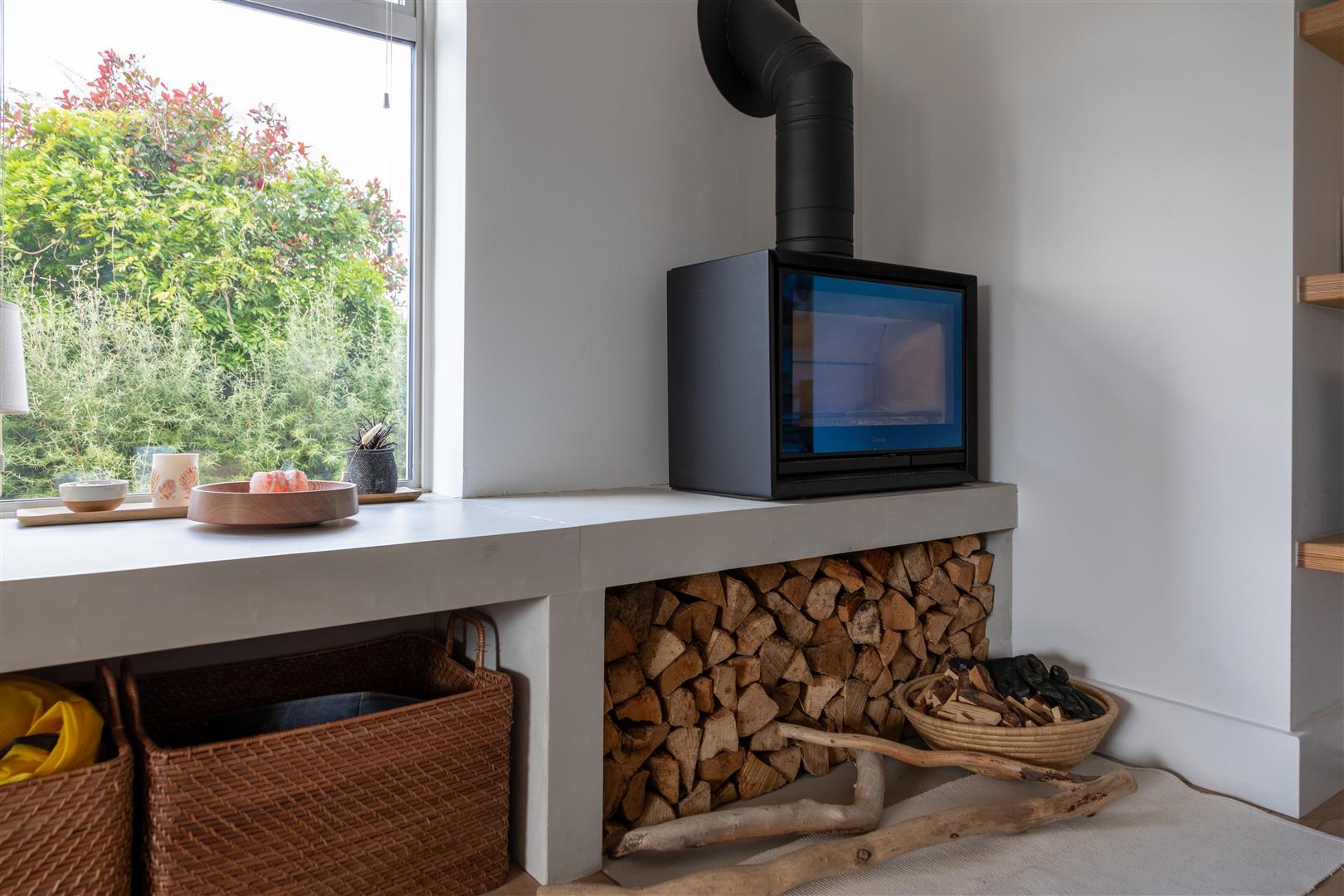 As you enter, a spacious and light-filled hallway greets you. To your left, the lounge offers a warm and inviting space to relax, complete with a cosy log burner and large windows that fill the room with natural light.