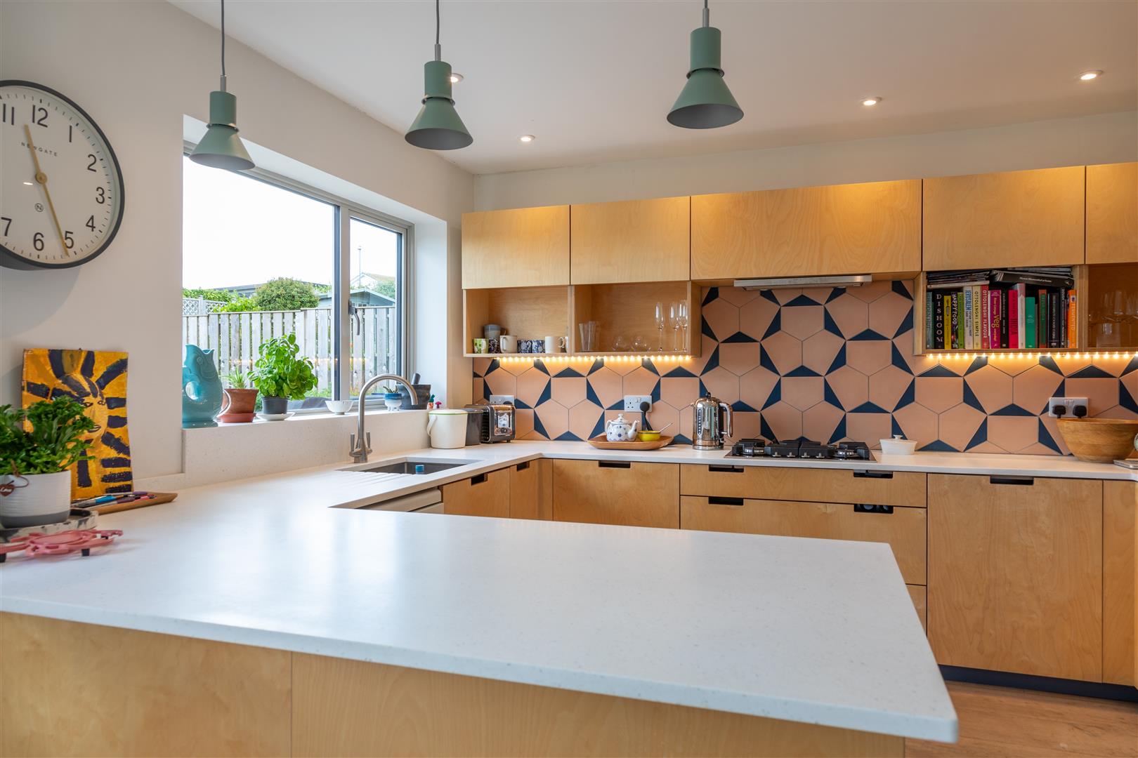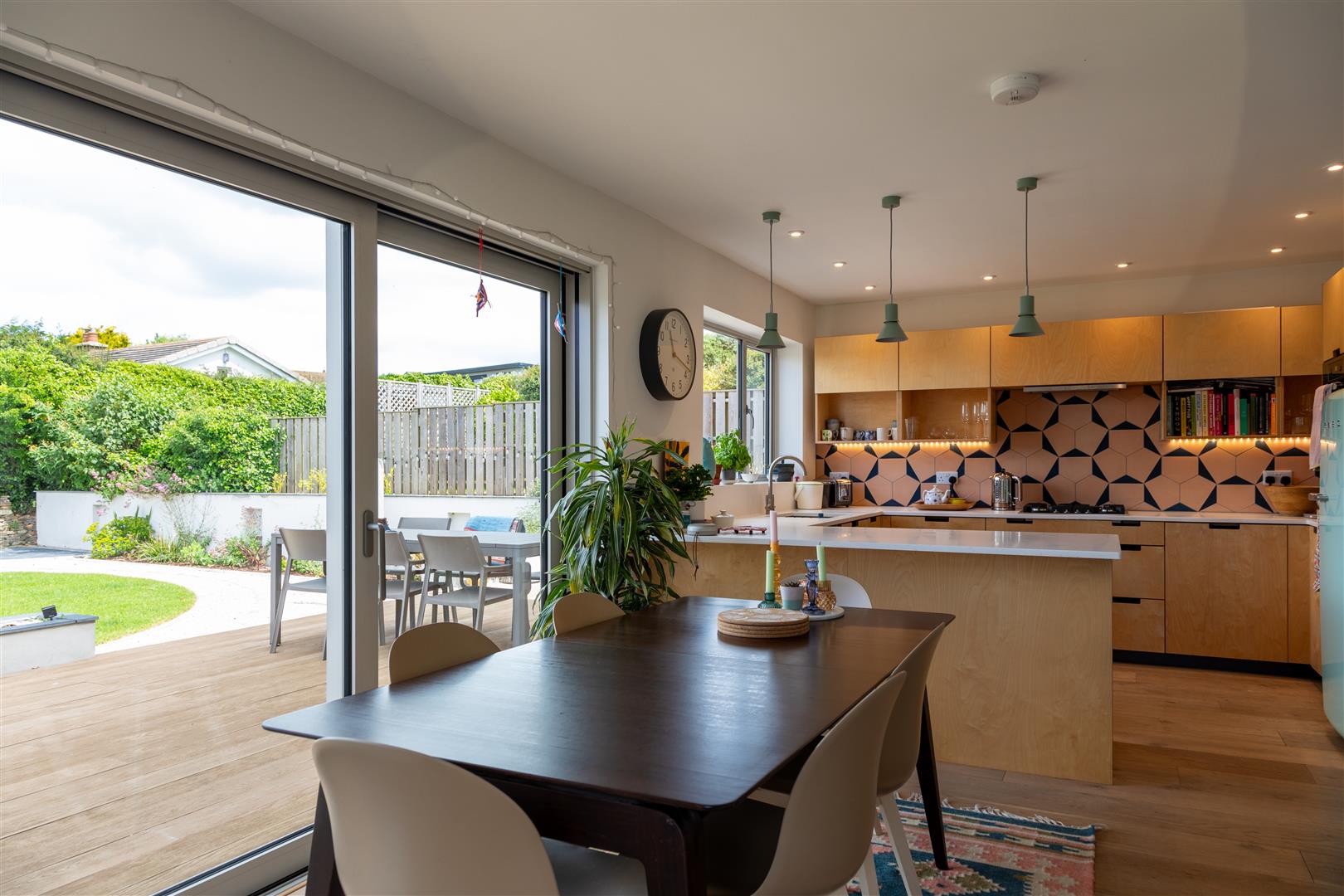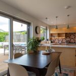 Moving further into the home, the open-plan kitchen and dining area is the heart of the property. The handcrafted kitchen is both stylish and functional, with premium finishes and an abundance of storage. The dining area, seamlessly connected to the kitchen, features sliding doors that open onto an expansive Millboard decking area, inviting you to extend your living space outdoors.