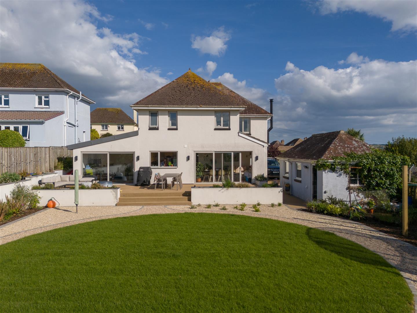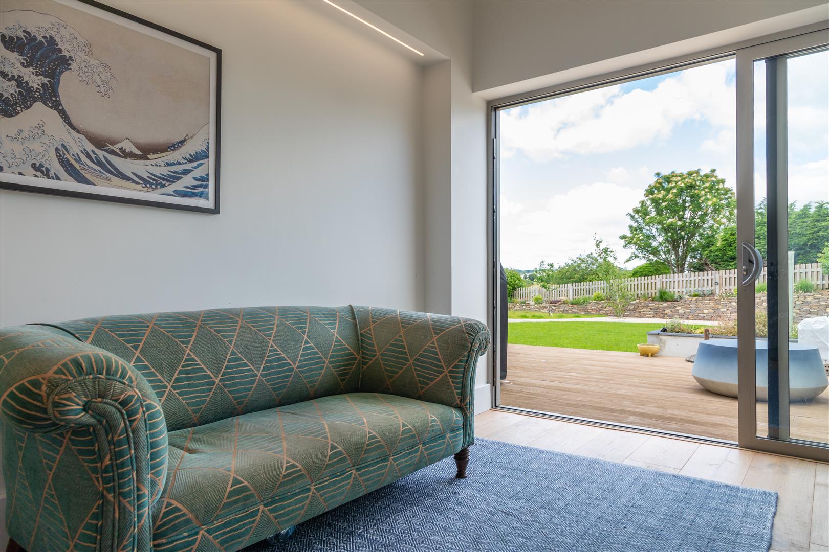Step onto the deck and take in the serene views of the private garden. The large lawn, bordered by fencing and a beautiful stone wall.