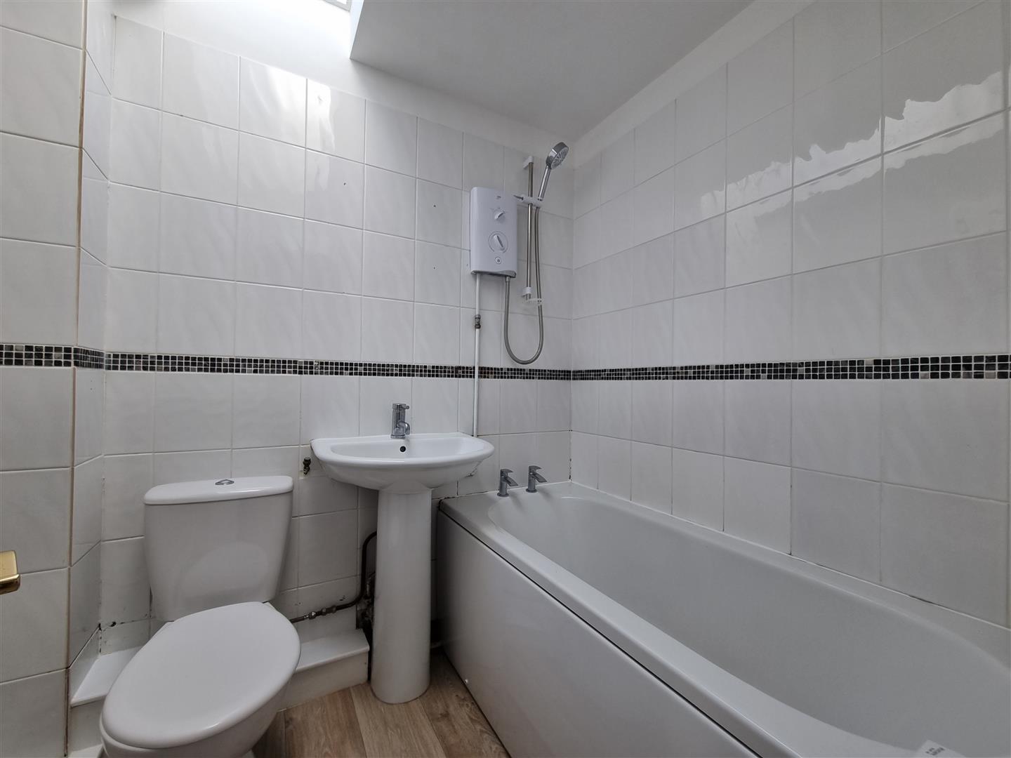 Bathroom. Comprising bath with thermostatic shower over. WC. Wash hand wash basin. Mirror and light over. Tiled walls. Heated towel rail. Sky light window.