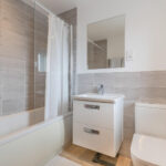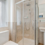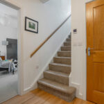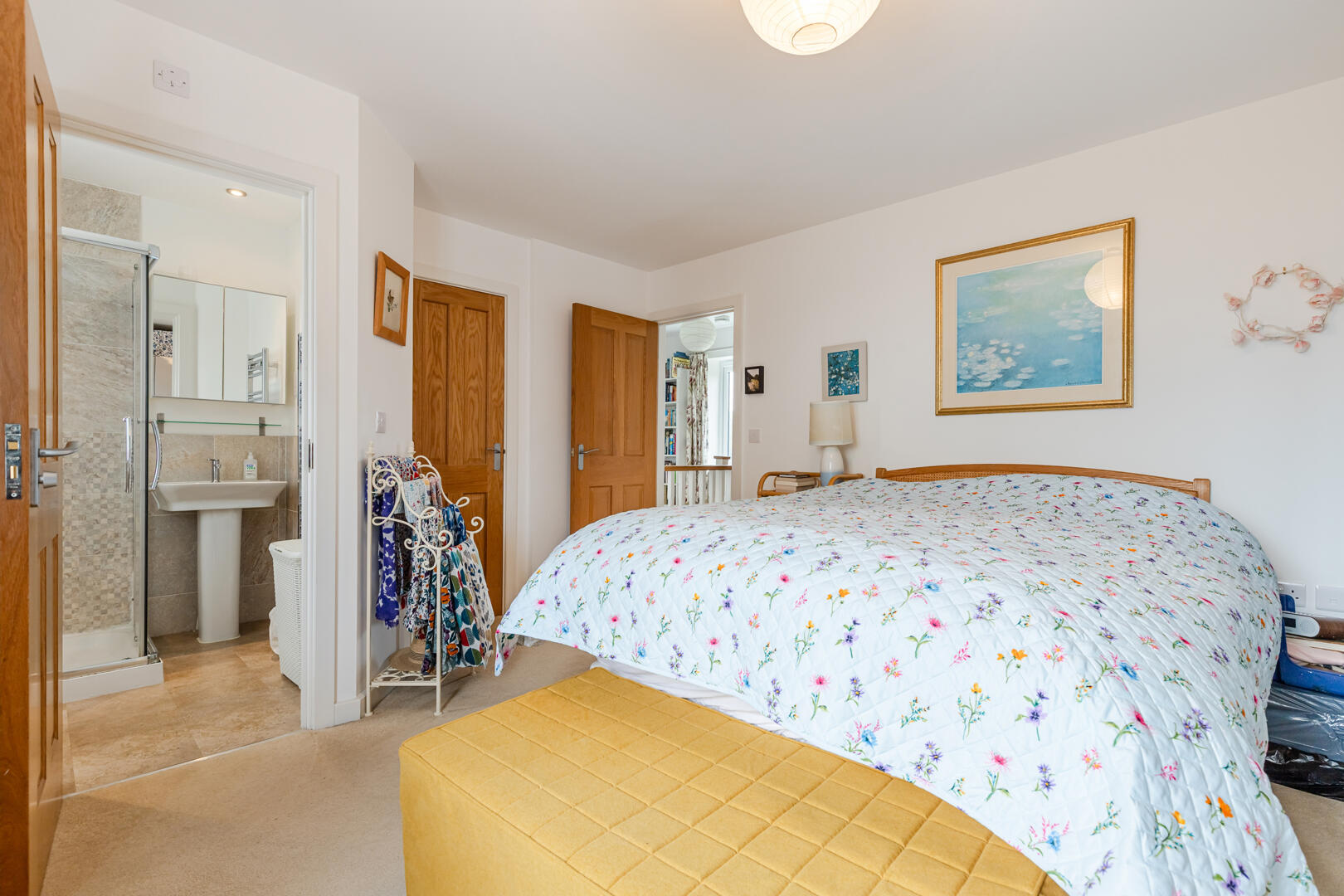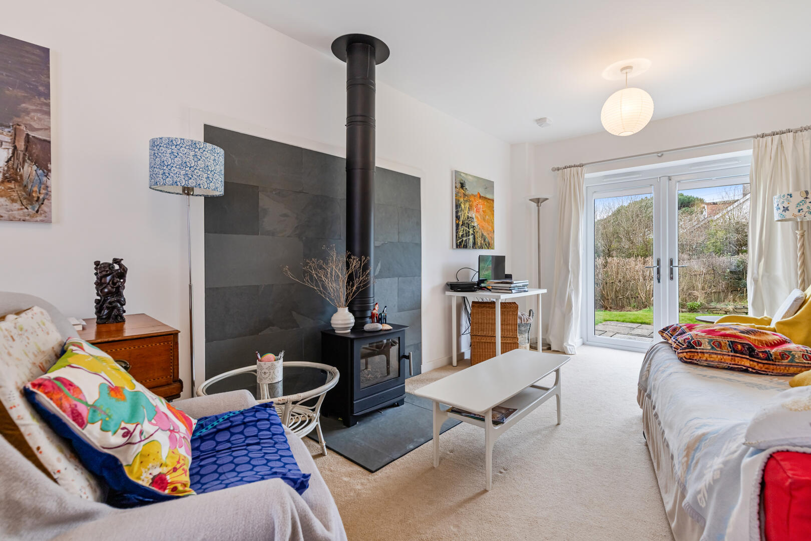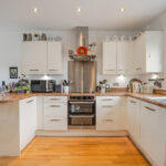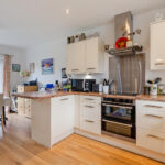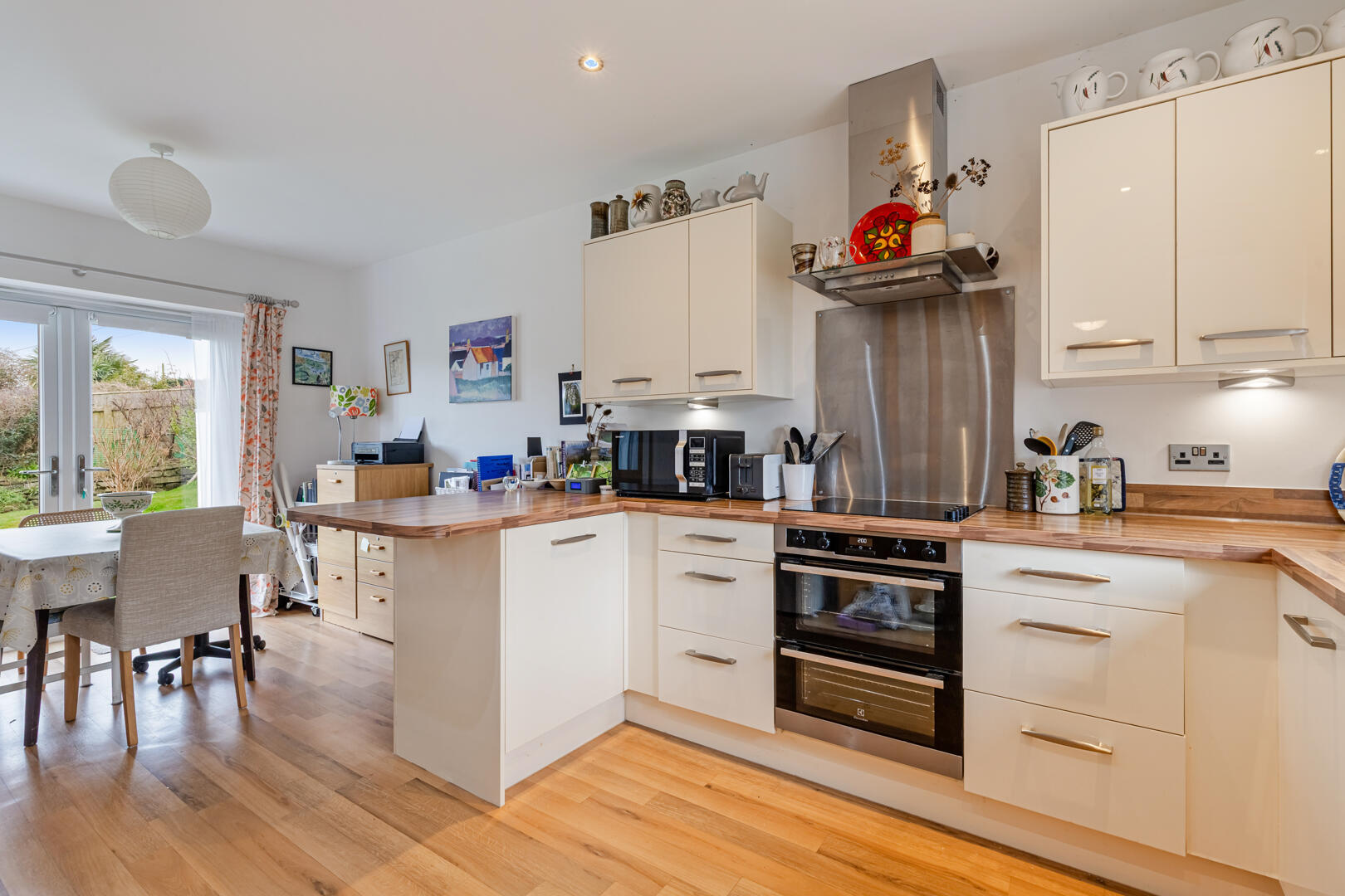 The ground floor features a spacious living room with a log burner and French doors leading to the garden, creating a seamless flow between indoor and outdoor living. The kitchen/dining room comes with integrated appliances and additional doors to the garden, while the utility room offers convenient rear access. Throughout the ground floor is underfloor heating with Karndean oak-effect flooring adding comfort and style.