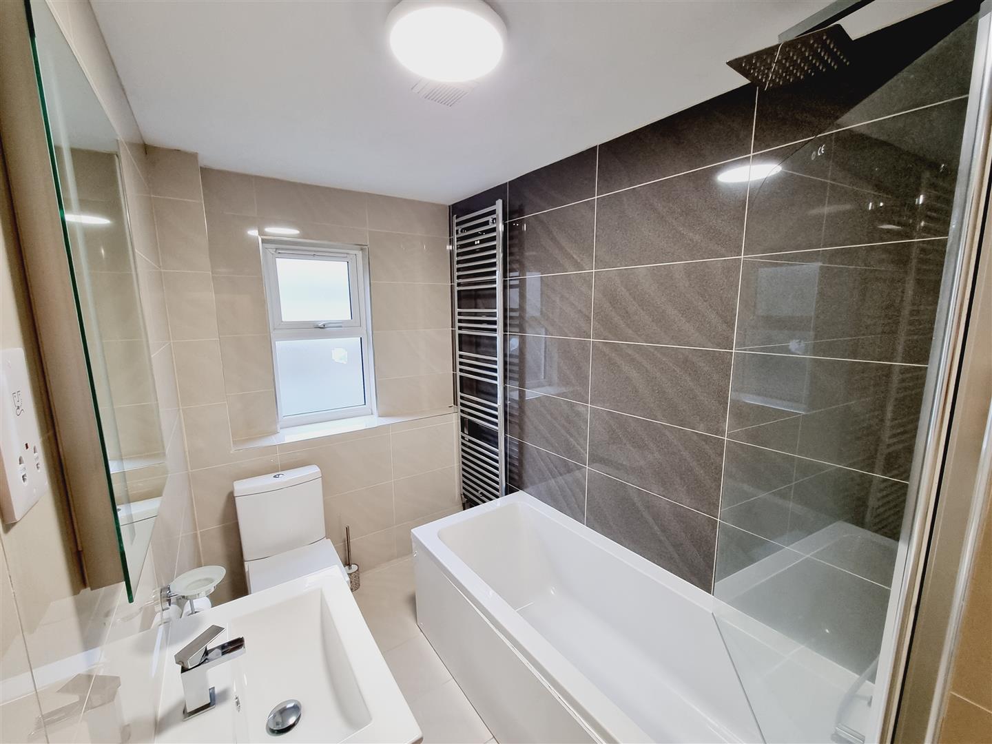 The good-sized double bedroom benefits from generous natural light and sufficient space for storage, ensuring a comfortable living experience. The stylish bathroom is a standout feature, with contemporary fittings and a luxurious rainfall shower over the bath, offering a spa-like atmosphere for unwinding after a long day.