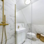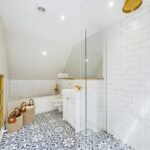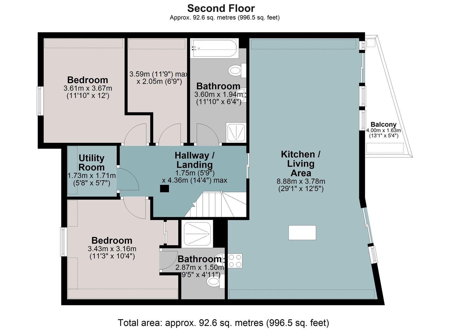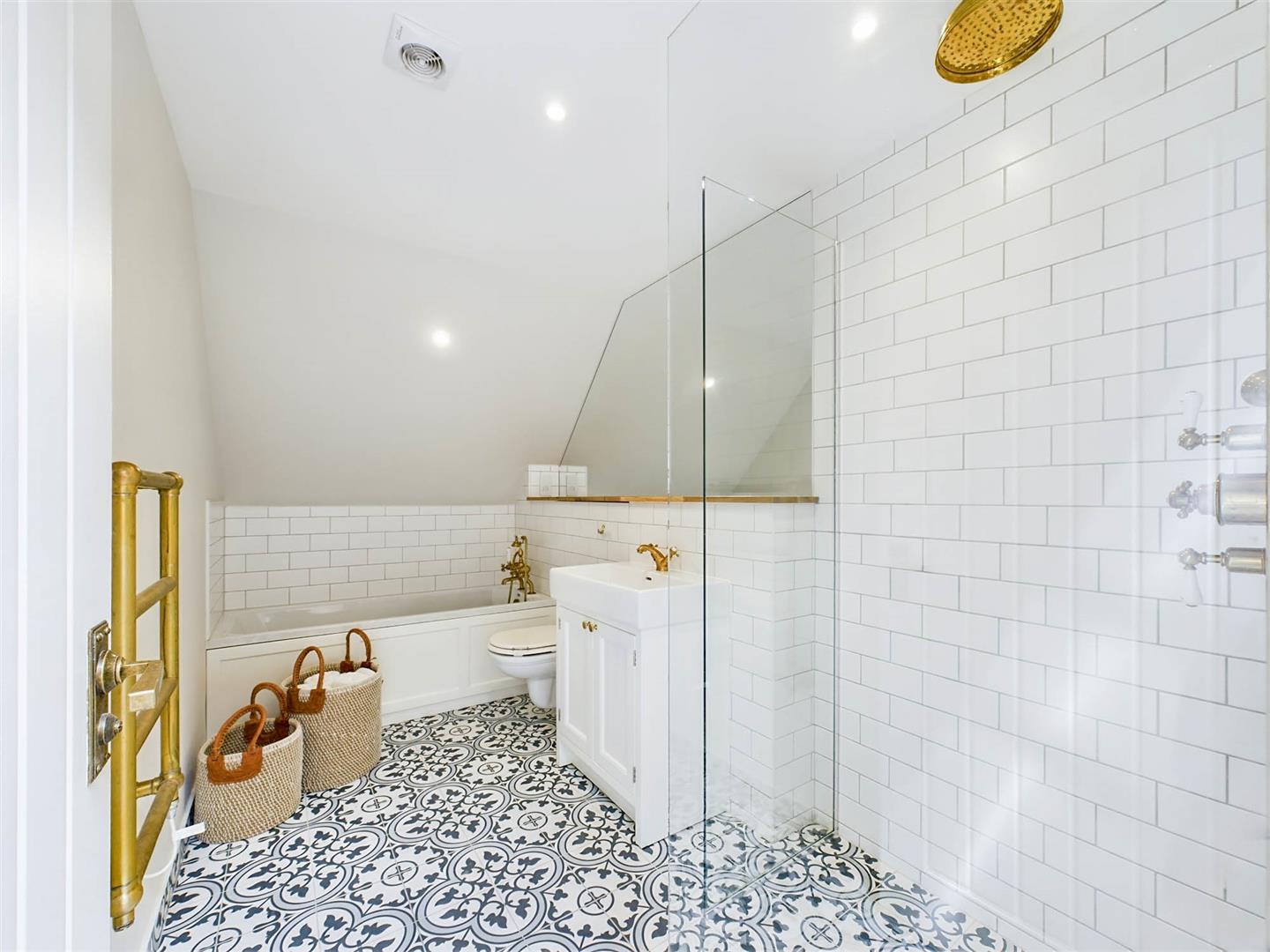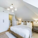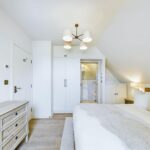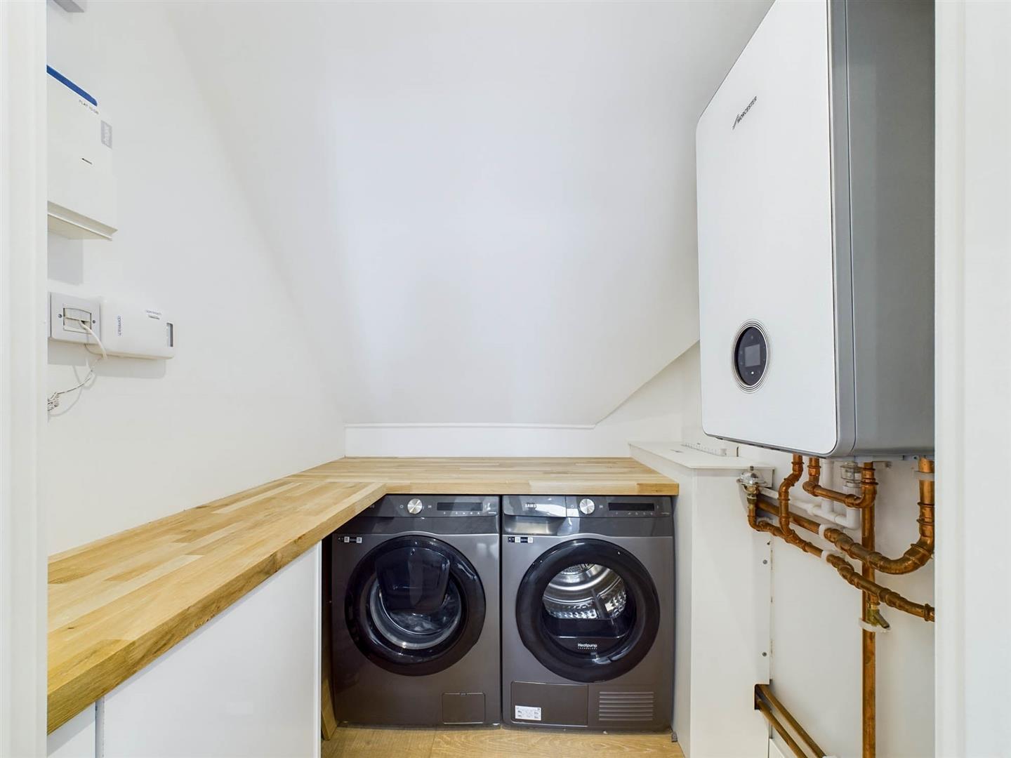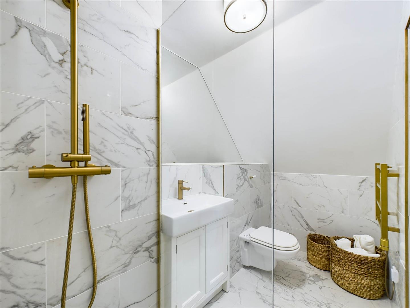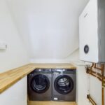 The penthouse includes three thoughtfully designed bedrooms. The master suite features an ensuite wet room with luxurious marble tiles and Lusso fixtures. The second bedroom is spacious and filled with natural light, while the third bedroom offers versatility as a potential study. A well-equipped utility room houses Samsung washer and dryer units for your convenience. The family bathroom includes both a walk-in shower and a bath, providing additional comfort.