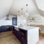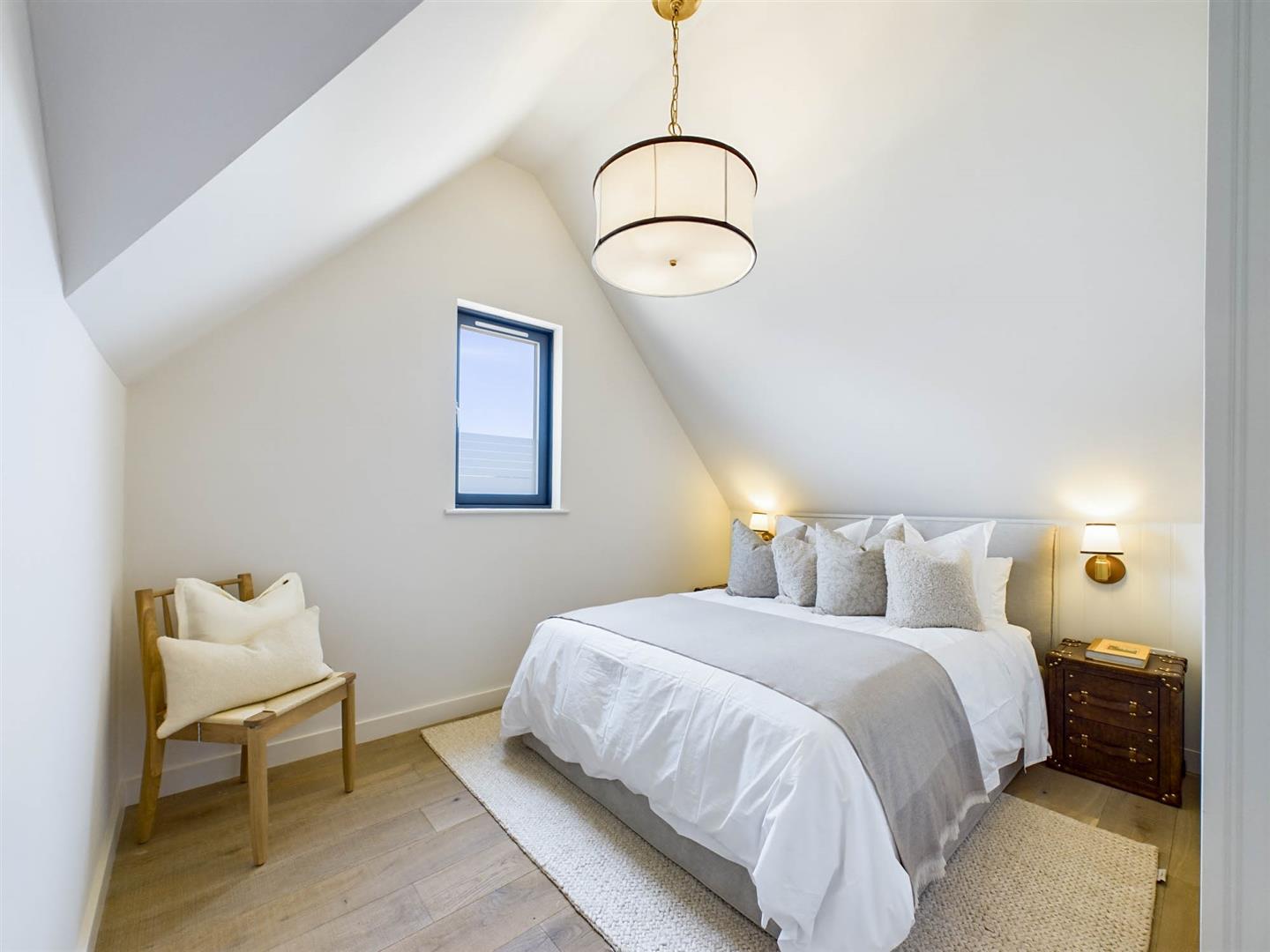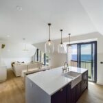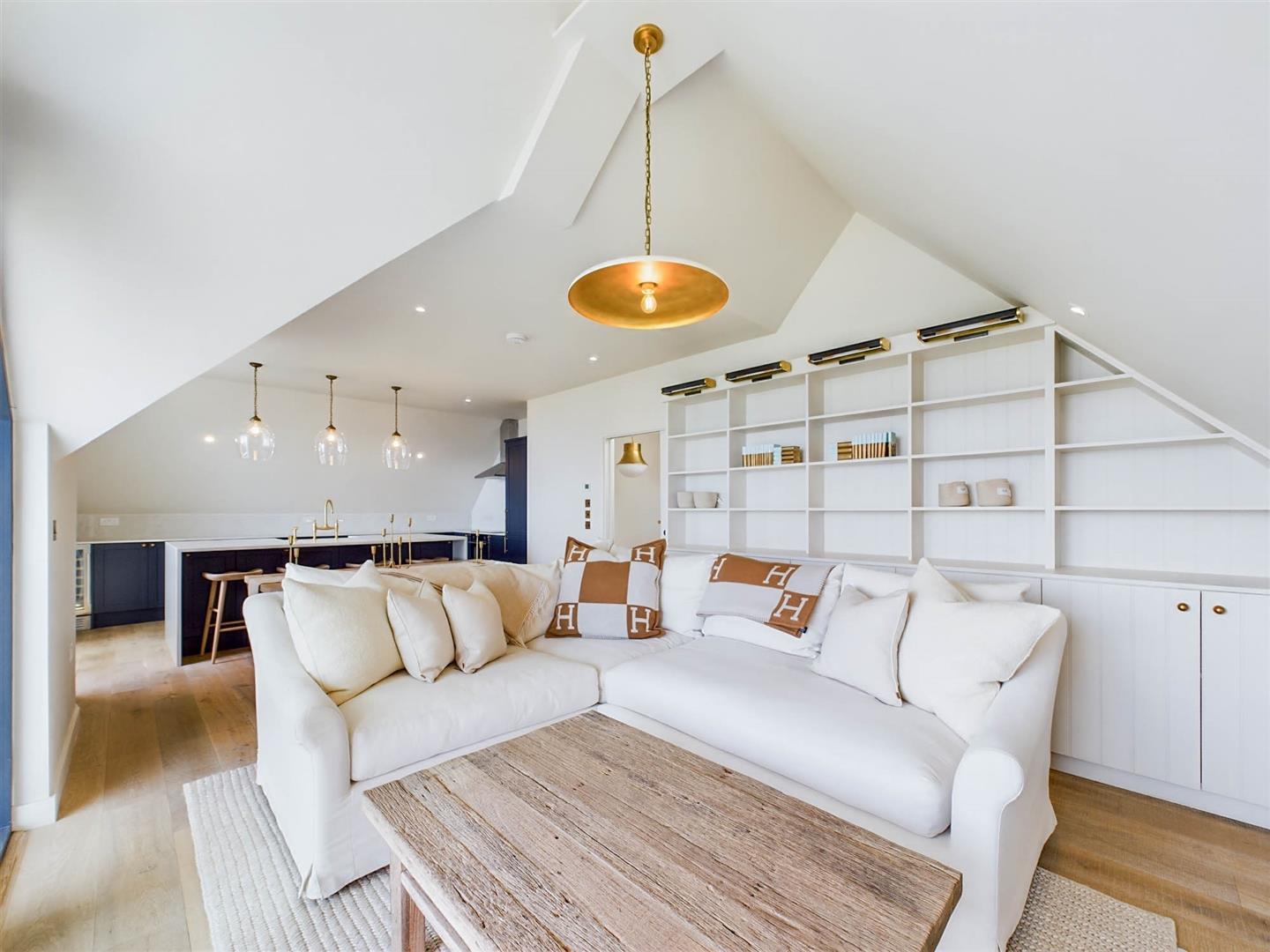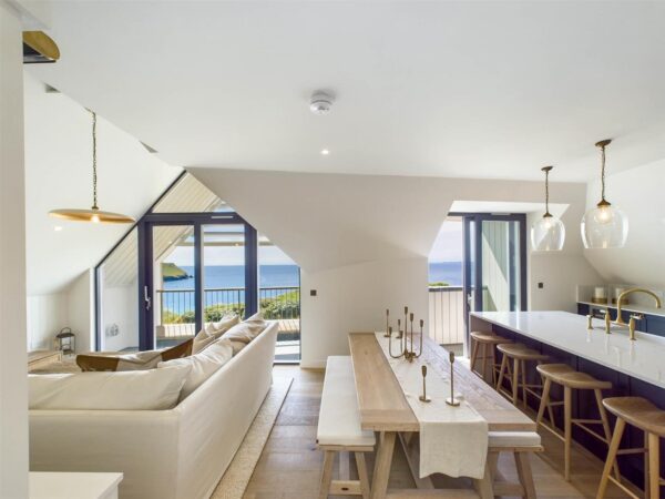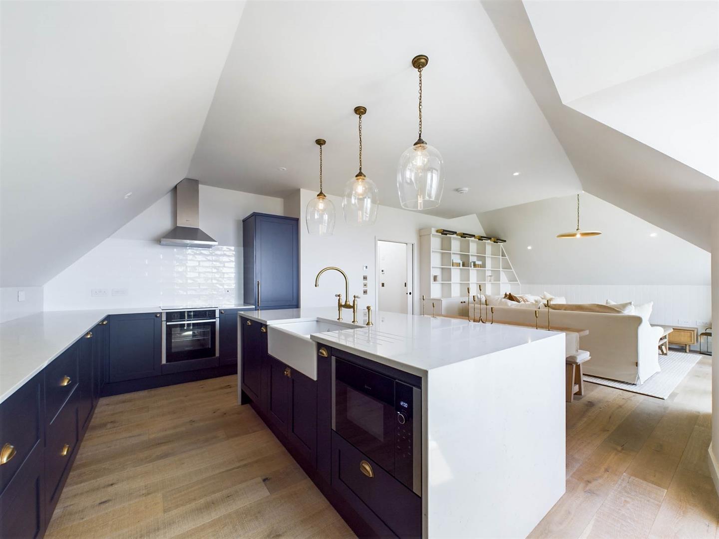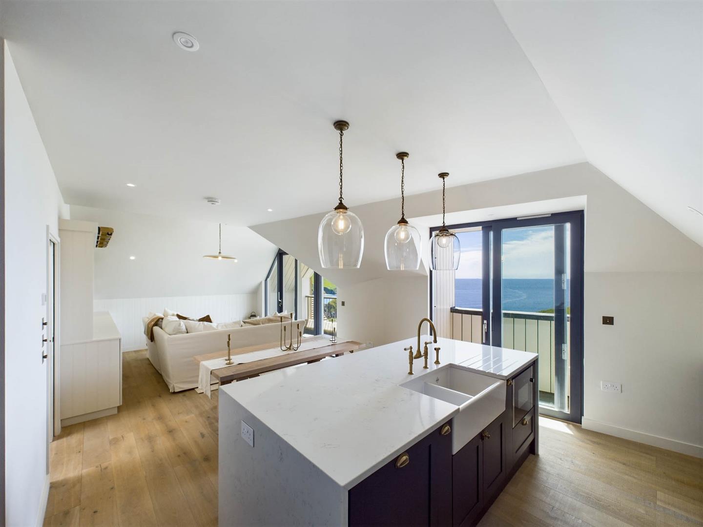 Welcome to Penthouse 2, a luxurious residence where elegance meets comfort. Upon entering, you are greeted by a stunning stairwell adorned with custom brass rods from Jim Lawrence. Ascending the stairs, you are welcomed into a bright and spacious penthouse. The heart of this home is the open-plan kitchen, living, and dining area, designed to the highest standard. The fully fitted kitchen features a beautiful island with waterfall edges, a built-in Shaws Shaker double farm sink, and Perrin & Rowe Ionian taps, all accentuated by Kelly Wearstler pendants. Integrated appliances, including a microwave, dishwasher, and oven, provide modern convenience. From the kitchen, step out onto the balcony and take in the breathtaking sea views.