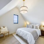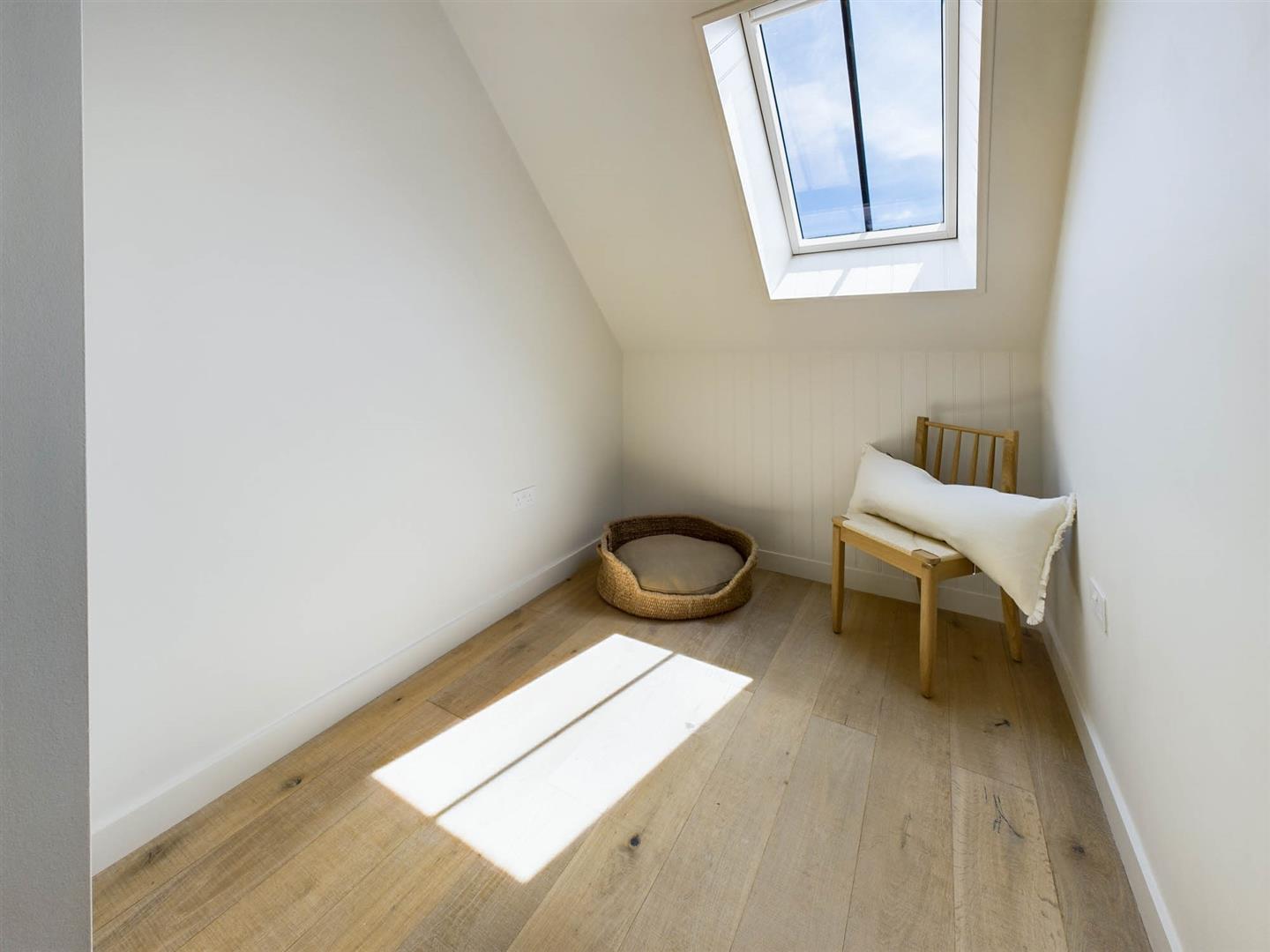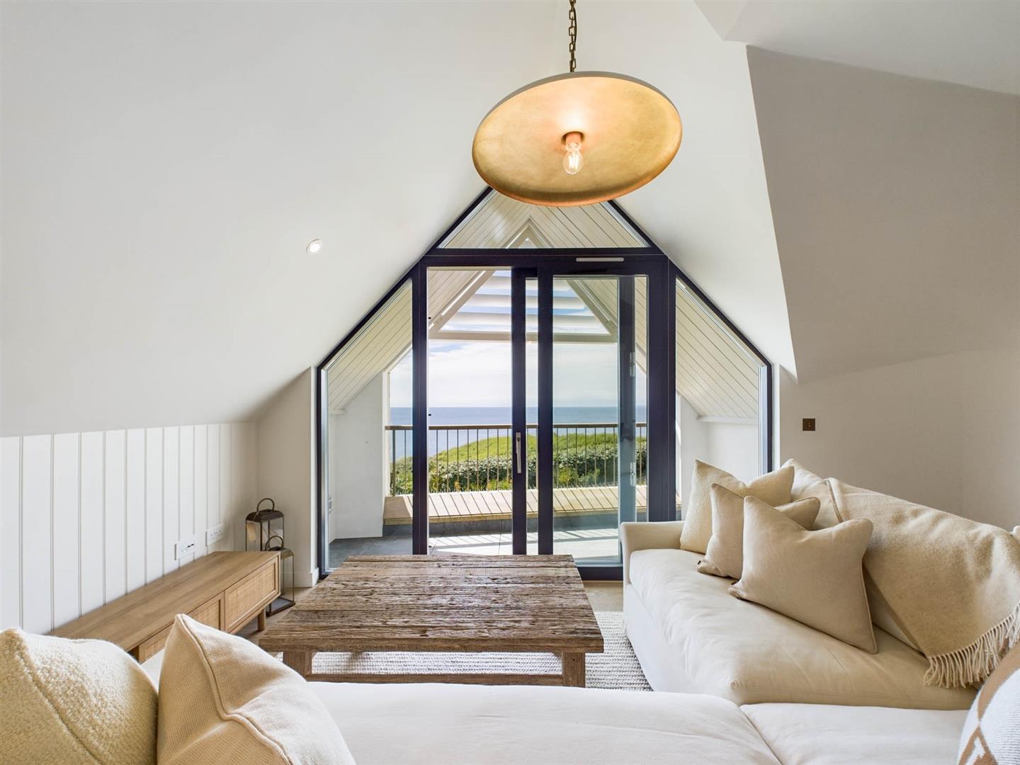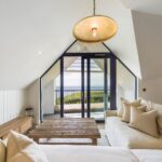 Adjacent to the kitchen, the dining area is centered around a Neptune Arundel table, leading seamlessly into the living room. This space boasts bespoke joinery and cabinetry, and an L-shaped Neptune Long Island sofa, all set against the backdrop of stunning sea views stretching from Hope Cove Harbour to Burgh Island.