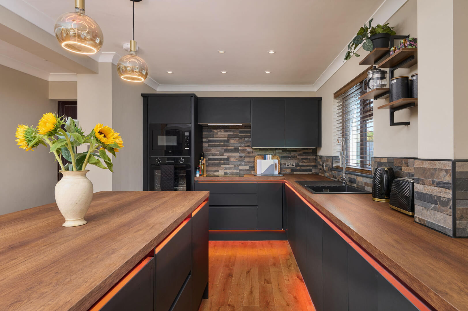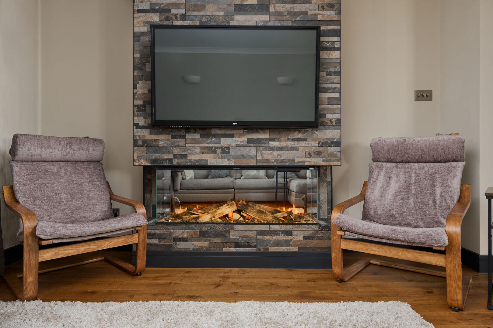 The living area is a standout feature, boasting a modern feature fireplace set against a striking stone feature wall, creating a warm and inviting atmosphere. From here, doors lead out to a private courtyard where you can enjoy uninterrupted views over the creek, providing a peaceful and scenic outdoor space. A convenient ground-floor cloakroom and W/C is also located on this level.