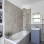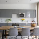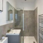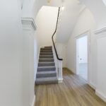 The open-plan kitchen, living and dining room is the heart of the home. Bathed in natural light from double-aspect, westerly-facing sash windows. The kitchen is finished to a high standard with white quartz worktops, Karndean flooring, integrated units, and premium appliances including a fridge/freezer, oven, induction hob, microwave, dishwasher, and washing machine.