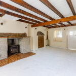 Archers Cottage is accessed via a front gate, opening into an enclosed front courtyard. The front door leads into a well-proportioned open-plan living and dining area, featuring exposed wooden beams and a character fireplace as focal points.