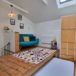 A metal spiral staircase leads up into a light and bright living/bedroom area with wooden flooring, vaulted ceiling with two skylights and French doors opening to a Juliet balcony. The double bed pulls out from a raised floor area and there are two hatch storage areas within the floor.