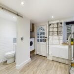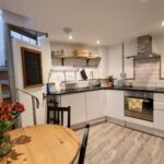 The front door enters into a kitchen/breakfast room with electric oven and induction hob. There is a utility area with space for washing machine and a storage cupboard under the stairs. A sliding door revels a shower room with WC and sink unit.